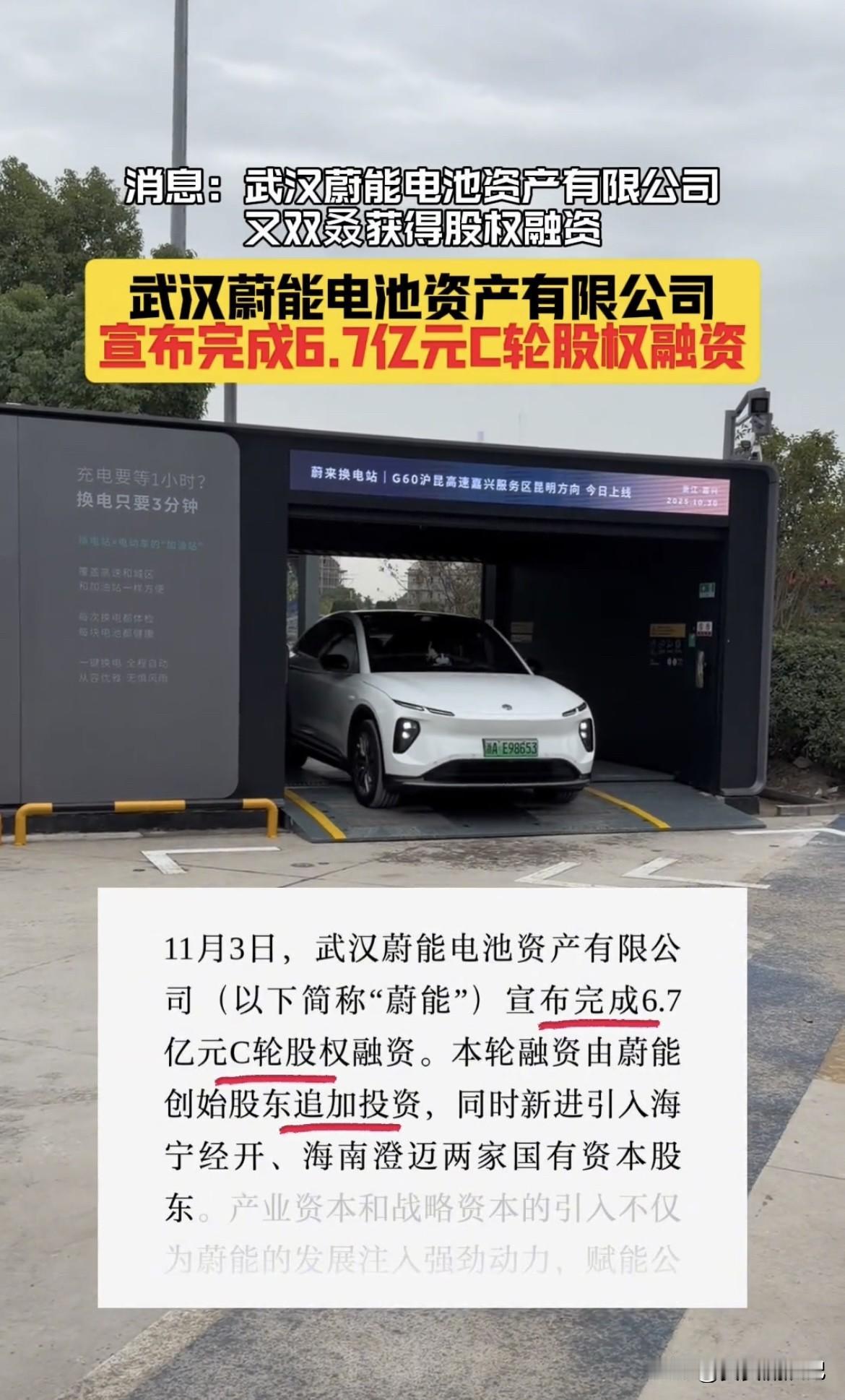 11月3日,武汉蔚能电池资产有限公司完成6.7亿元C轮股权融资,这消息够炸裂!本轮融资既有创始股东追加投资,还引入海宁经开、海南澄迈两家国有资本股东。 蔚能成立五年多实力不俗,运营电池资产规模超30GWh,服务超40万用户,申请专利超160项,发明占比59%。融资资金会用于电池业务投放和技术研发。7月它还和宁德时代战略合作,涉及股权投资、换电网络等多领域。这次融资是重要里程碑,期待蔚能在电池领域带来更多惊喜!