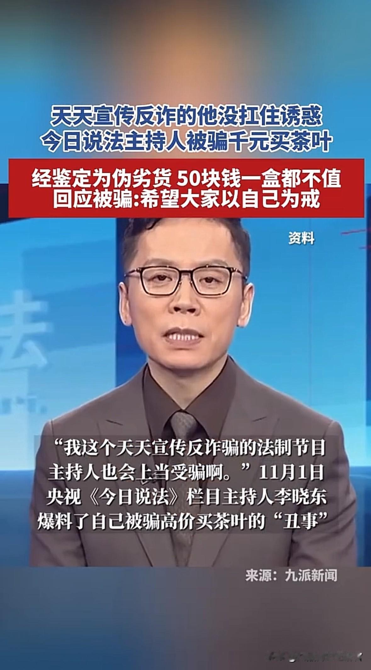 今日说法主持人被骗,还是烂大街套路 近日,央媒《今日说法》主持人李晓东自曝被“茶叶套路”诈骗千元买茶叶,后经鉴定茶叶价值不足50元,这可真是天天打鹰,可是被鹰啄了眼。 我们生活里,很多人自诩为聪明人,对那些不屑一顾的微末伎俩十分鄙视。觉得谁也骗不了自己,可看咱们这位主持人,不也上了一档。 往往最厉害的诈骗套路,反而越常用。和你玩的就是心理战。老有人句话,骗子骗的就是聪明人,一句“我是秦始皇”都是笑话一样的存在,可是依然骗了很多人,希望大家能提高警惕,这样被骗成为热点,多少都很尴尬。今⽇说法