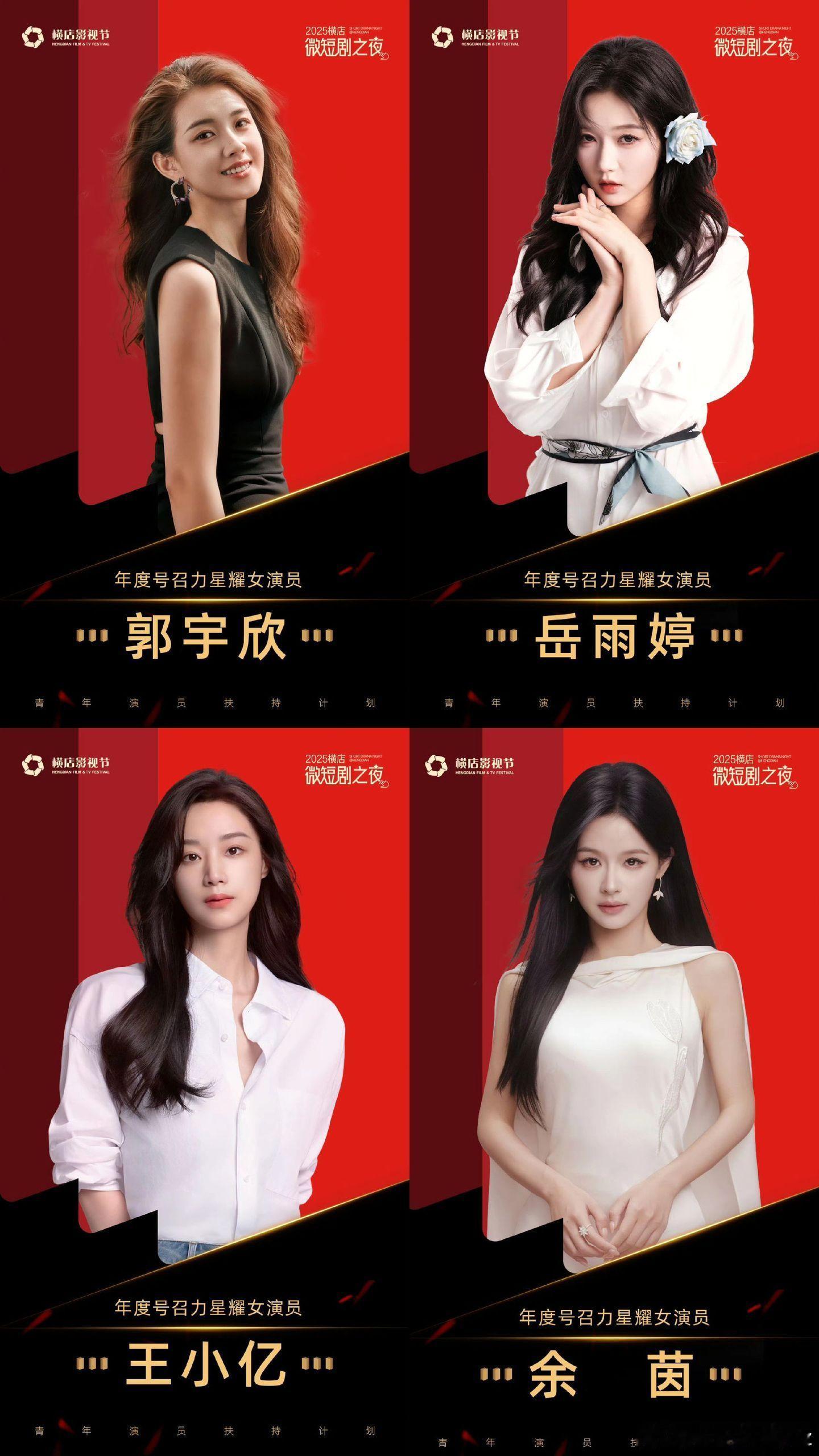 恭喜郭宇欣 、岳雨婷 、余茵、王小亿获2025横店微短剧之夜年度号召力星耀女演员。