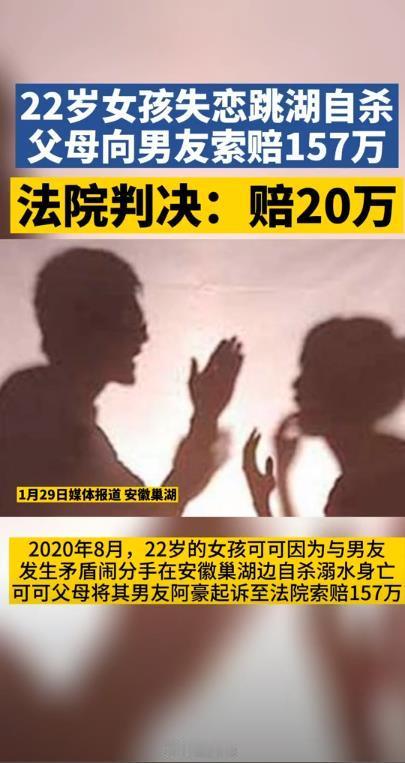 2020年安徽,女孩因男友提出分手争吵,后女子跳湖自杀。法院认为,女方的自杀行为与男友没有关系,男方不存在过错,但考虑到女方的死亡对其父母造成精神打击,最终判决男方补偿女方父母20万。