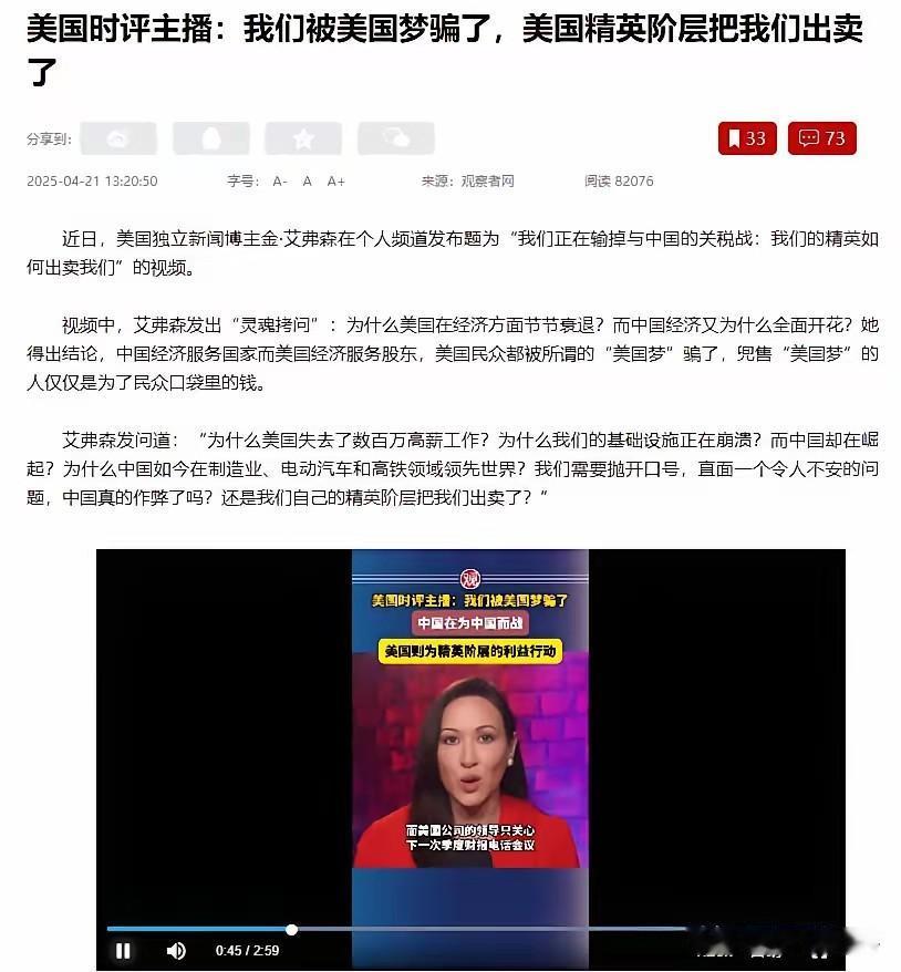 美国民众终于觉醒!美国一名美女主播一句话捅破窗户纸,她表示:中国在为中国而战,而美国的统治阶层在为自己的利益行动,所以,真正的问题不在于中国在‘作弊’,而在于我们被那些向我们兜售‘美国梦’的人欺骗了! 美国一名美女主播的一番话最近在社交平台上炸了锅,短短几天就被转发数百万次,不少网友直呼“终于有人说出了实话”。 她直言中国只是在为自己的国家发展而努力,真正该警惕的不是所谓的“外部威胁”,而是那些天天兜售“美国梦”、实则只为自己谋利的统治阶层,这番话精准戳中了无数美国人的痛点。 主播的言论能引发如此大的共鸣,并非空穴来风,而是美国民众对现状不满情绪长期积累的爆发。最新的Hill-HarrisX民意调查显示,57%的已登记选民都认为,美国的政治制度根本不是为普通人服务的,而是只对拥有金钱和权力的精英阶层敞开大门,只有32%的人还相信制度能惠及所有人 。 这种感受在女性群体中更加强烈,63%的女性选民都觉得政治制度只为少数内部人士运作,比男性高出了12个百分点。 更让美国人难以接受的是“美国梦”的破碎。《华尔街日报》和芝加哥大学的联合调查发现,现在只有25%的美国人相信自己有机会大幅改善生活水平,这是1987年以来的最低值。 近70%的人直接否定了“努力工作就能成功”的说法,认为这个曾经的信念要么早已失效,要么从未真正成立过 。年轻人的处境尤为窘迫,房租和物价居高不下,即便有工作也很难攒下钱,不少人不得不退回父母家居住,曾经触手可及的买房计划变得遥不可及,56%的受访者直言对购房“几乎没有信心”。 这种普遍的失望情绪,源于现实与宣传的巨大落差。美国的统治阶层和利益集团往往打着“国家利益”的旗号行事,背后却藏着清晰的利益链条。 就像保守派青年组织“美国转折点”,十年间募资近3.9亿美元,主要捐赠者多是与共和党关系密切的富豪和基金会,他们通过资金支持影响组织理念,进而维护化石燃料、国防工业等特定行业的利益 。这些利益集团推动的政策,最终往往让少数人获益,普通民众却要承受物价上涨、就业不稳的压力。 有数据显示,即便是经济指标看似稳健的当下,也只有17%的美国人认为美国经济优于其他国家,近40%的人反而觉得其他地区经济更好,这种认知变化让美国传统的“例外论”自信不断崩塌 。 从2008年金融危机到新冠疫情,再到持续的通胀压力,普通民众经历的“三重打击”,在精英阶层那里却很难得到真正的回应。就像那位主播说的,当中国在专心为民众创造发展机会时,美国的一些决策者却在为金主和利益集团服务,这种对比让越来越多人看清了真相。 如今,美国社会的信任裂痕正在扩大,无论是对政治制度还是对精英阶层的信任度都持续走低。人们逐渐意识到,所谓的“外部竞争威胁”更像是转移注意力的幌子,真正的问题出在内部——那些被寄予希望的管理者,早已把个人和小团体的利益放在了民众福祉之上。这种觉醒,正在慢慢改变美国人看待世界和自身的方式。 对此,你们有什么看法,欢迎评论留言~