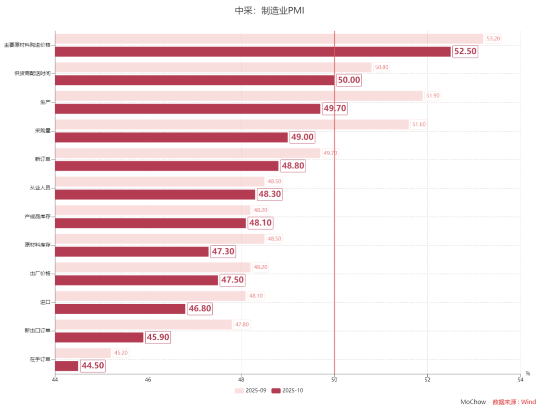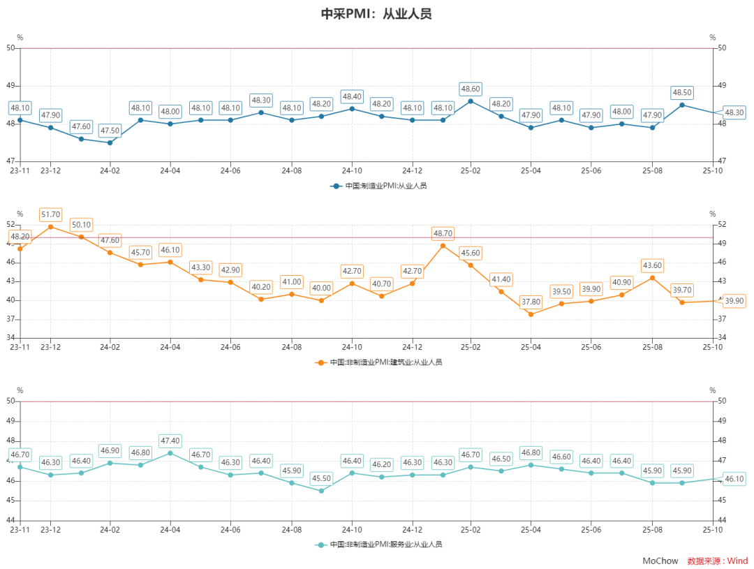 就业市场持续承压。10月从业人员指数为48.3%,较上月下降0.2个百分点,连续七个月低于临界值,表明制造业就业形势依然严峻。
