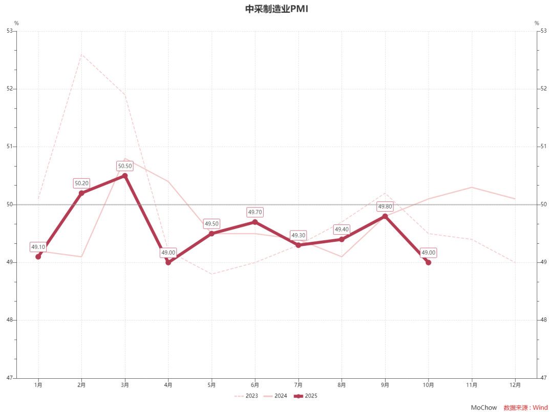 2025年10月,中采PMI为49.0%,较上月回落0.8个百分点,连续第七个月位于收缩区间,创下2025年4月以来新低。这一数据标志着中国制造业景气度在经历短暂修复后再度承压。详情如下: