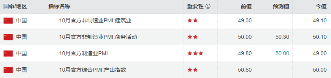 10月制造业PMI为49.0(预期50.0,前值49.8);