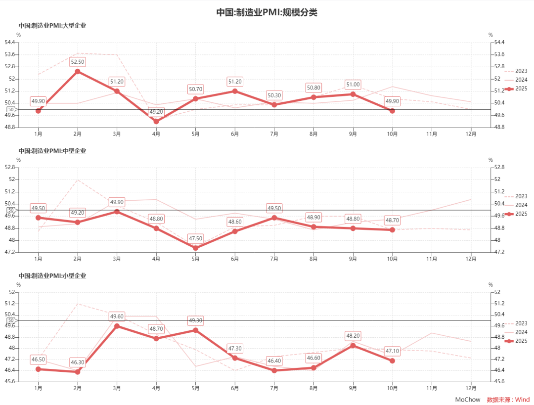 各规模的企业均落入收缩区间。10月大型企业PMI为49.9%,较上月大幅回落1.1个百分点,结束了此前连续五个月的扩张态势。中型企业PMI为48.7%,较上月下降0.1个百分点;小型企业PMI47.1%,大幅下降1.1个百分点。
