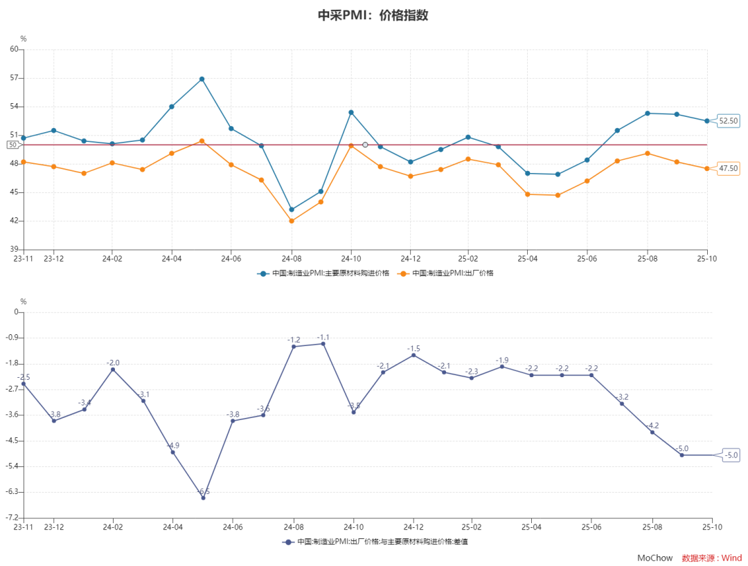企业仍处于去库阶段。10月产成品库存指数为48.1%,较上月微降0.1个百分点,连续四个月低于荣枯线,表明仍处于去库阶段。结合其他指标,如采购量指数大幅回落2.6个百分点至49.0%,为两个月来首次收缩;原材料库存指数下降1.2个百分点至47.3%,创2025年6月以来新低;生产经营活动预期指数为52.8%,较上月回落1.2个百分点。这些数据共同表明,企业正在通过减少采购、消耗现有库存来应对需求不足,属于典型的主动去库存行为。