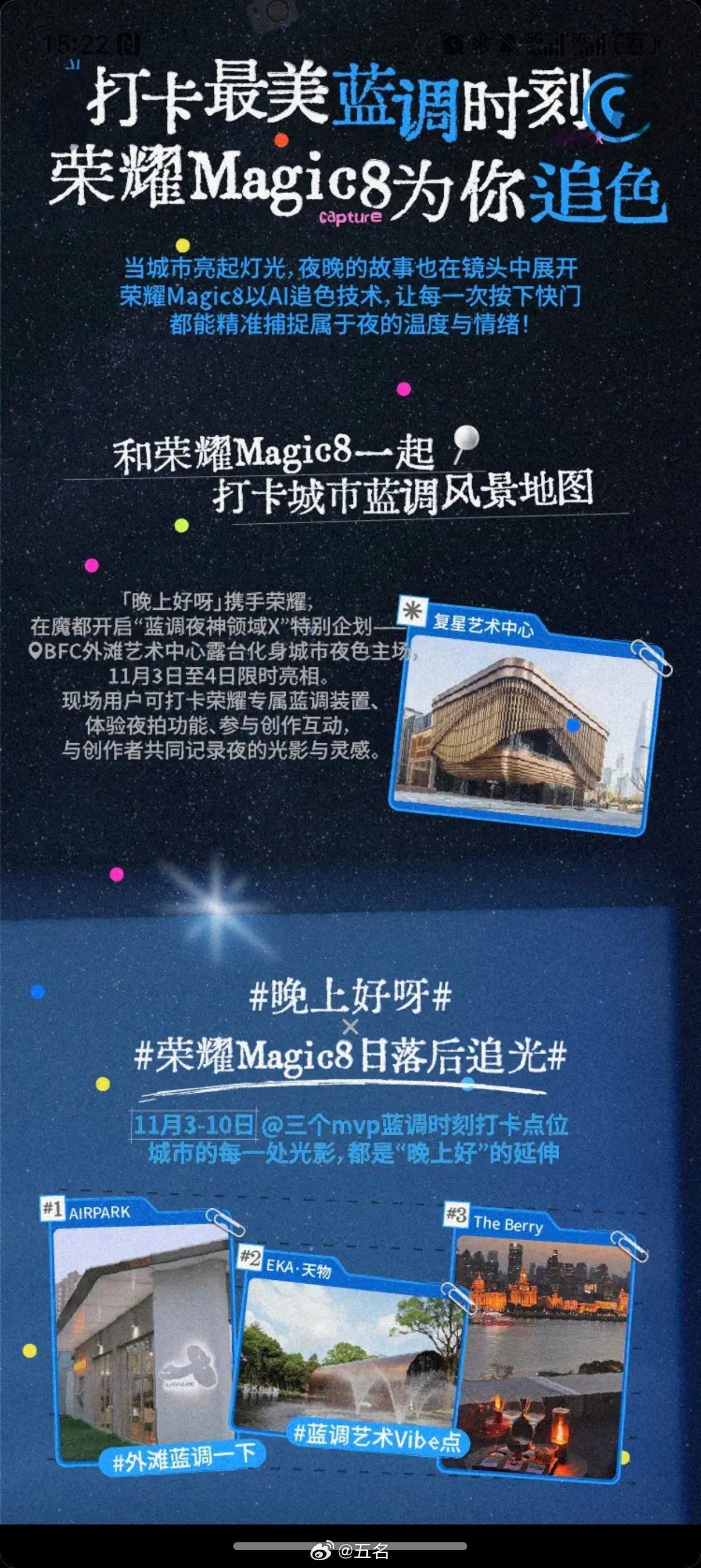 荣耀Magic8系列联合巨量大事件IP《晚上好呀》,将于11月3-4日在上海复星艺术中心天台举办"日落后追光"线下活动。