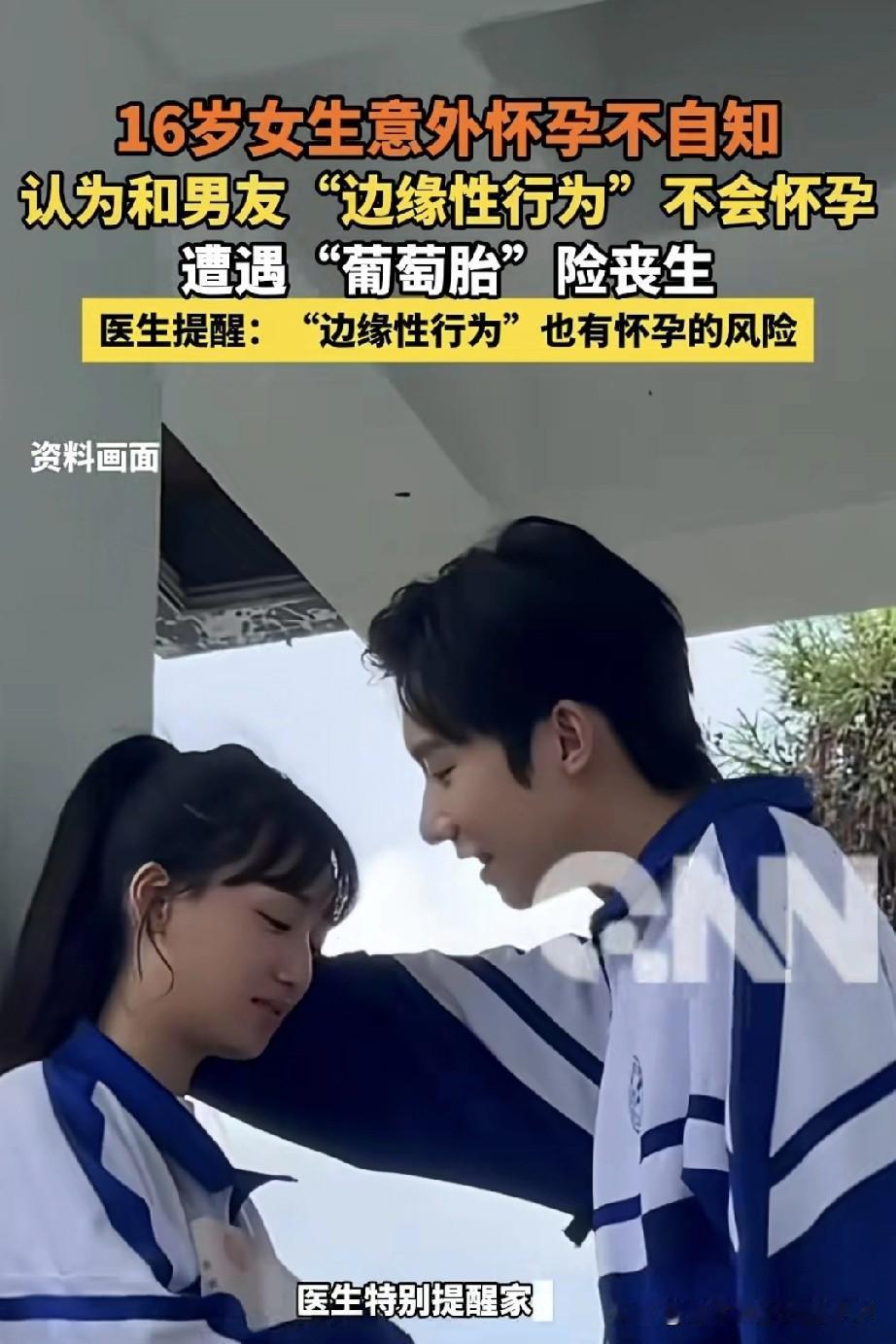 16岁女生意外怀孕却浑然不知,她以为和男朋友进行边缘性行为不会怀孕,却不料遭遇葡萄胎,险些丢了性命。我实在讨厌“意外”这两个字!只要发生了性行为且“成功”,就无法排除“播种发芽”的可能性。所以,根本不存在“意外”这种既想寻求刺激又不想让“种子”发芽的荒谬说法(采取了防护措施的情况才可称为意外)。 16岁本是如花的年纪,不该因无知而坠入深渊!“边缘性行为不会怀孕”是多么危险的认知误区,葡萄胎带来的教训惨痛至极。家长不应羞于和孩子谈性,学校也不能疏于性教育,青少年更要树立正确的性观念。要知道,不了解性健康知识,看似“边缘”的行为也可能引发足以摧毁人生的风暴。 很多人不清楚葡萄胎的严重性,这么说吧,在所有重大疾病保险所标明的重大疾病中,排在首位的是恶性肿瘤,第二位便是葡萄胎。 医生提醒,边缘性行为,也有怀孕风险。