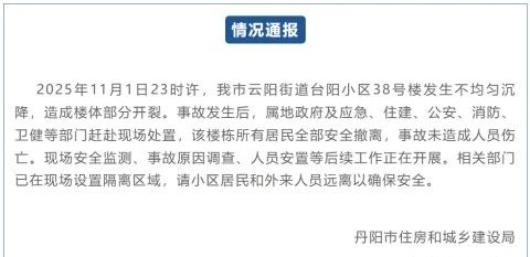 深夜突发!小区楼体开裂,官方:全部撤离! 11月2日,江苏丹阳日报发布情况通报: 11月1日23时许,丹阳市云阳街道台阳小区38号楼发生不均匀沉降,造成楼体部分开裂。事故发生后,属地政府及应急、住建、公安、消防、卫健等部门赶赴现场处置,该楼栋所有居民全部安全撤离,事故未造成人员伤亡。现场安全监测、事故原因调查、人员安置等后续工作正在开展。相关部门已在现场设置隔离区域,请小区居民和外来人员远离以确保安全。 视频显示,该楼栋部分墙体已严重变形,露出里面的砖块。2日下午,台阳小区附近一位商户对极目新闻记者介绍,台阳小区属于老小区,已有二三十年历史。他的商铺在小区外,未受此次事件影响。 台阳小区所属社区工作人员告诉极目新闻记者,目前社区正同小区居民沟通相关事宜。 丹阳市住房和城乡建设局工作人员表示,目前该局正在配合街道办开展后续工作,涉事楼栋的后续处置需要待专家勘验及相关流程。 湖北头条