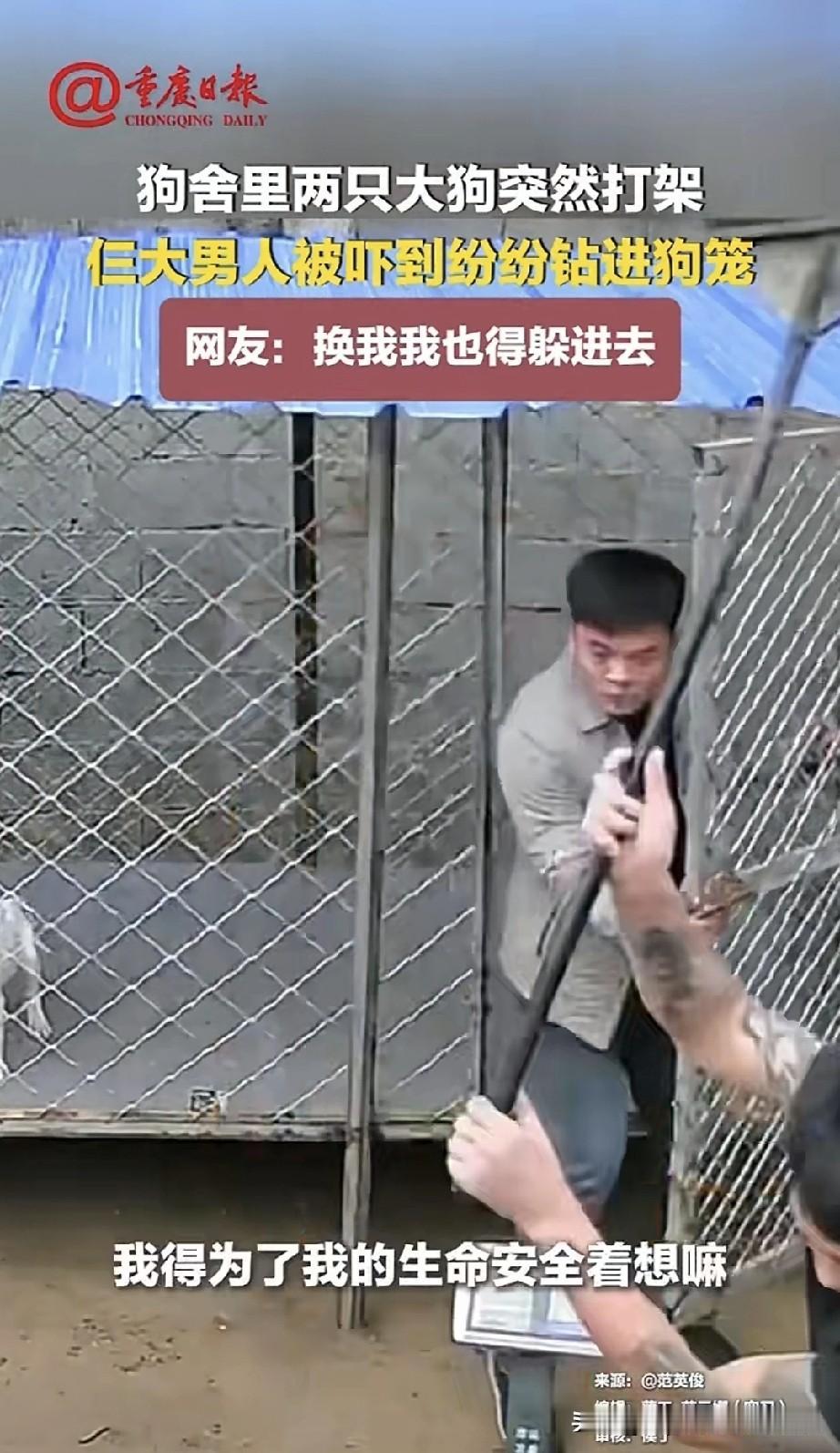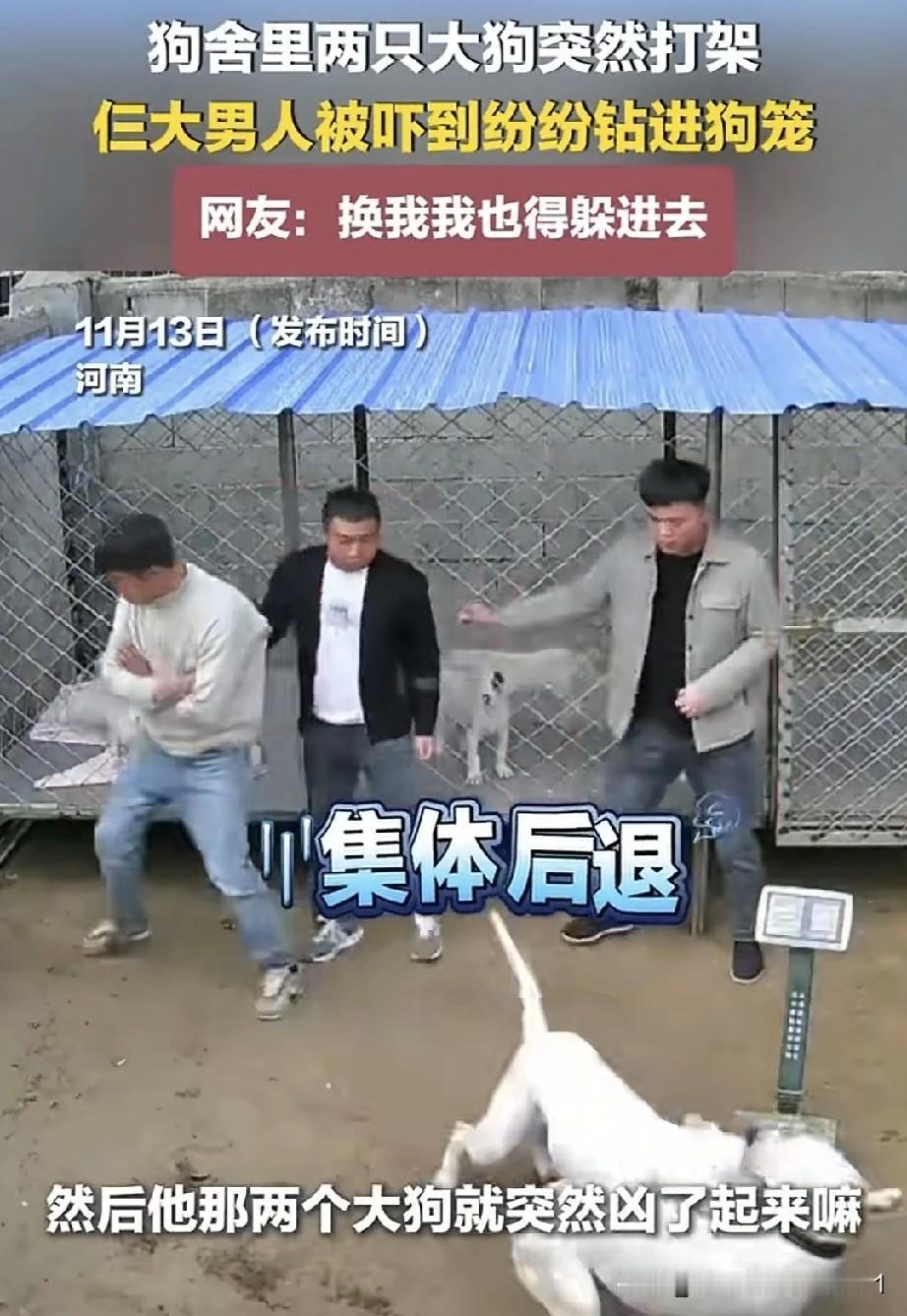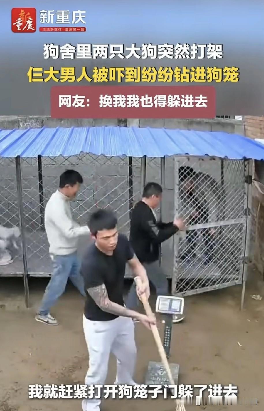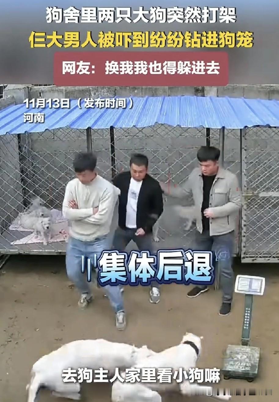 这三条真狗,把门锁上吧!一天喂一顿就行。男子带着朋友去狗主人家看小狗,没想到两只大狗突然凶狠地打起来了。朋友当时十分害怕、慌张,躲在墙角,胳膊和腿都不受控制了。男子为自己的生命安全考虑,怕被误伤,便哆哆嗦嗦地打开小狗的狗舍门钻了进去,两位朋友见状也跟着钻了进去。狗主人正忙着拿扫把拉架,没顾得上他们。狗主人把狗拉开后回头一看,三个人整整齐齐地蹲在小狗舍里,安全地“吃瓜”,把狗主人乐坏了。