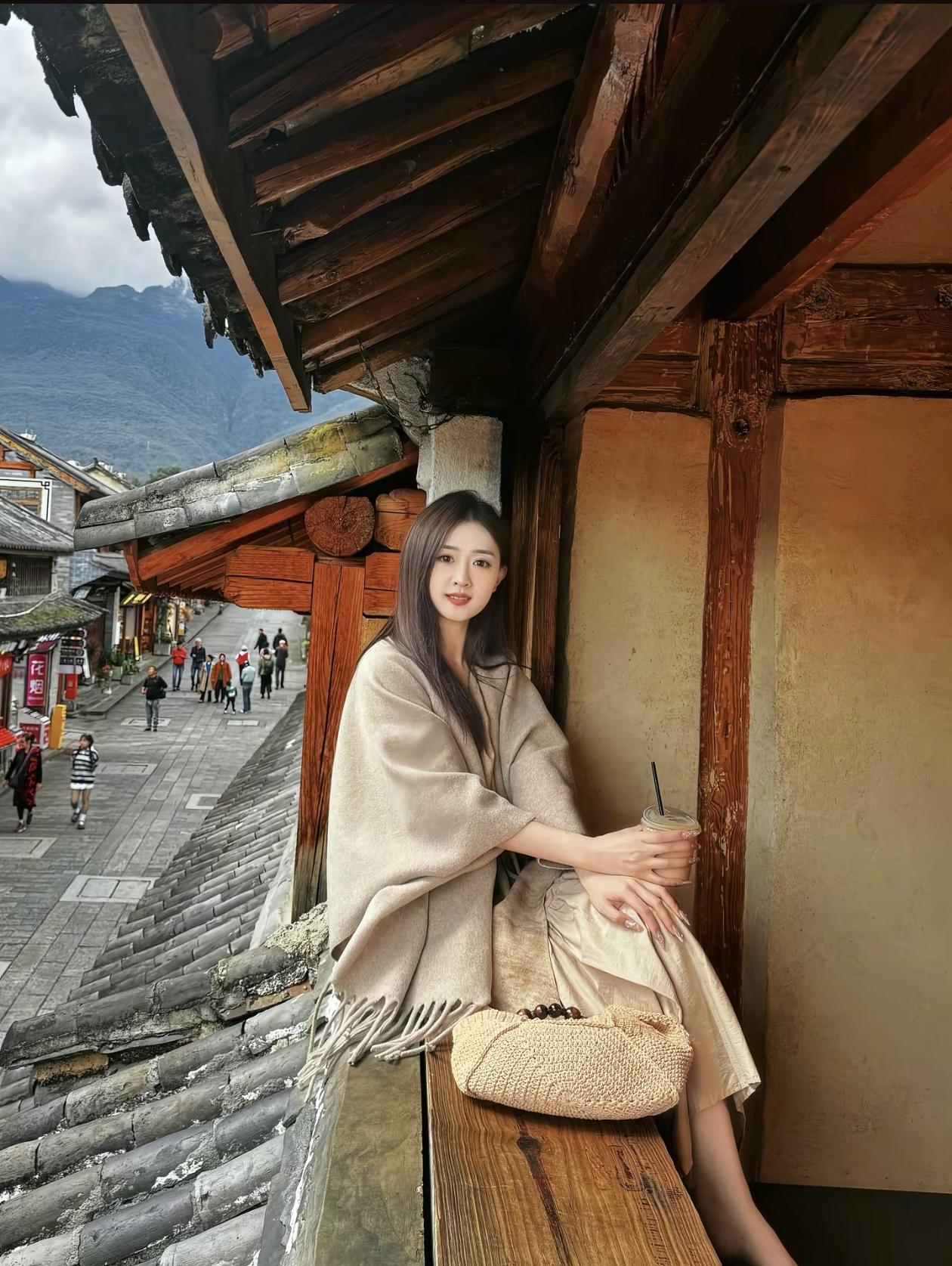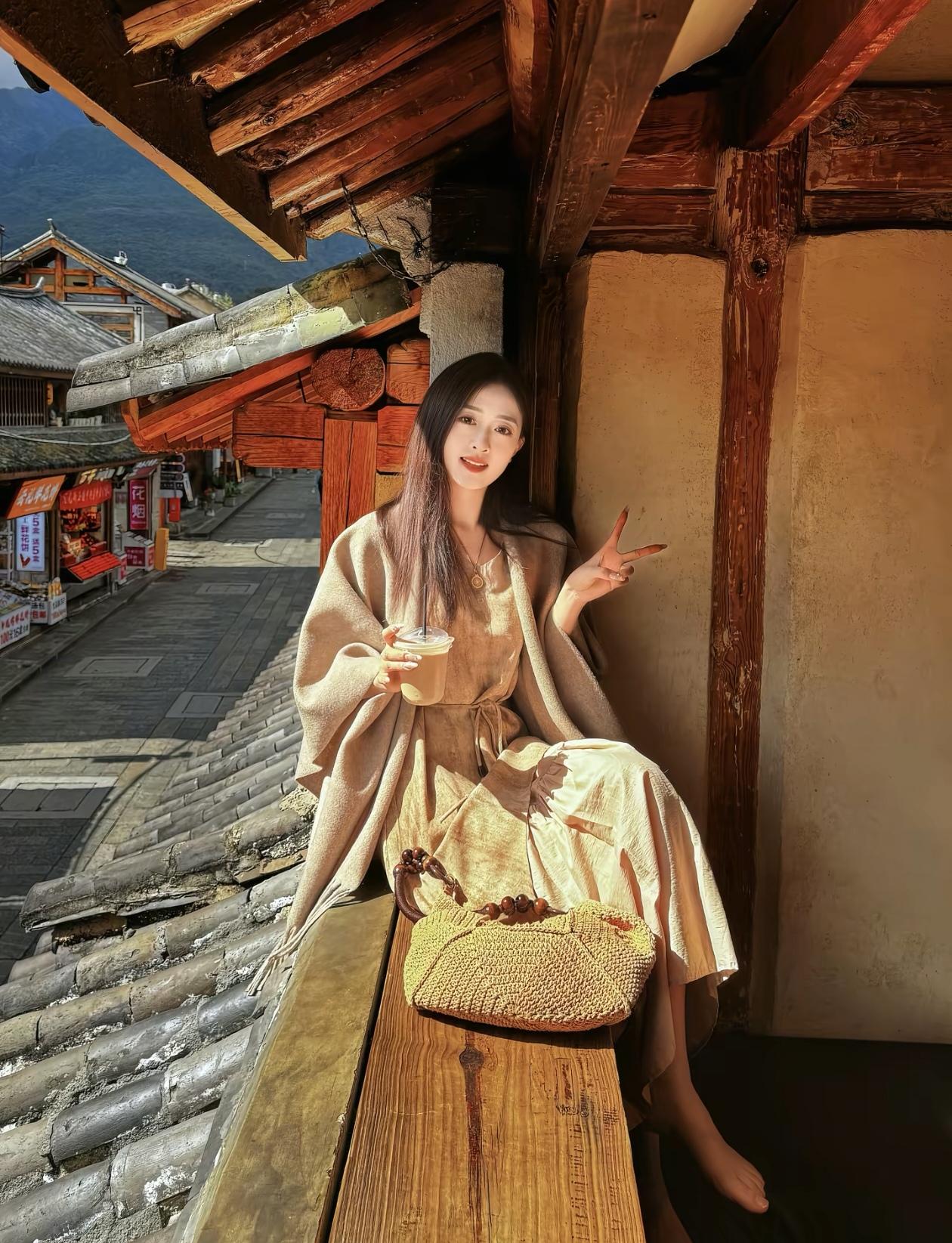 古风少女在古镇街角,手捧茶饮,悠然自得。