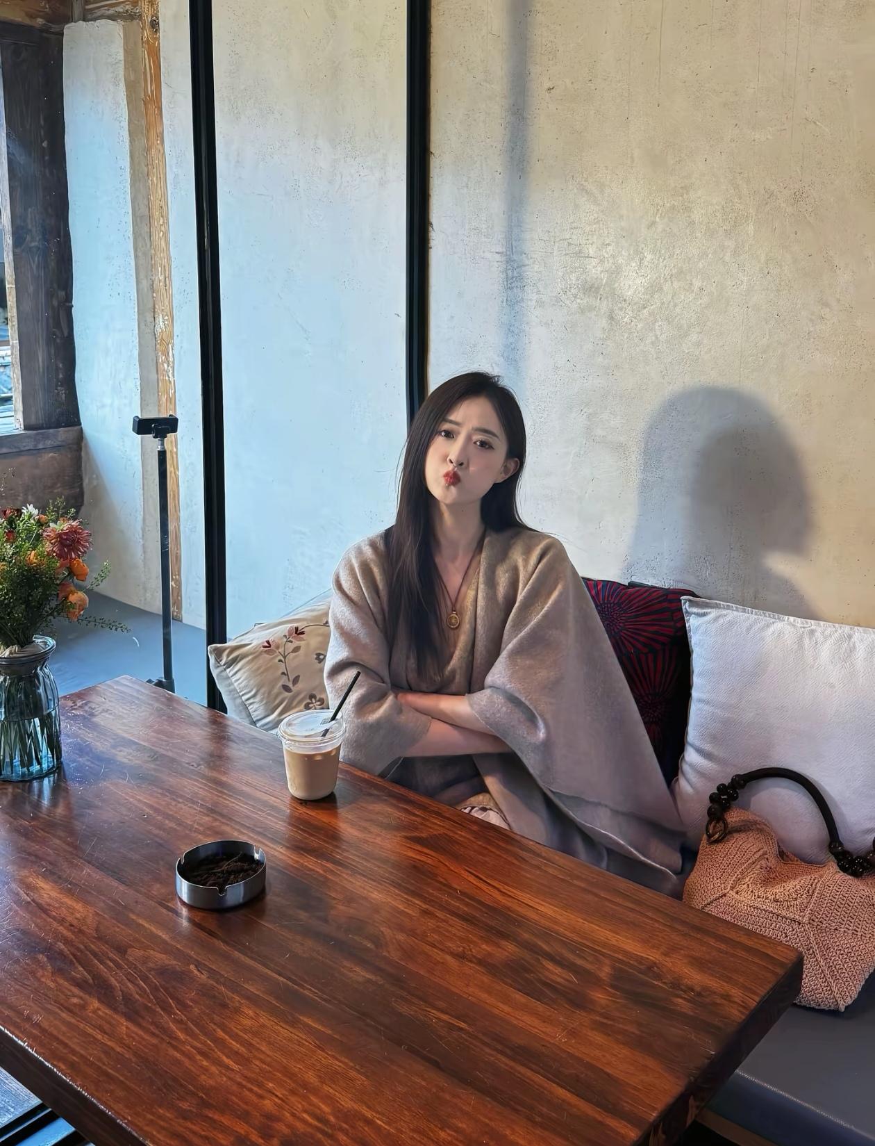 秋日暖阳下,木屋前的甜美少女