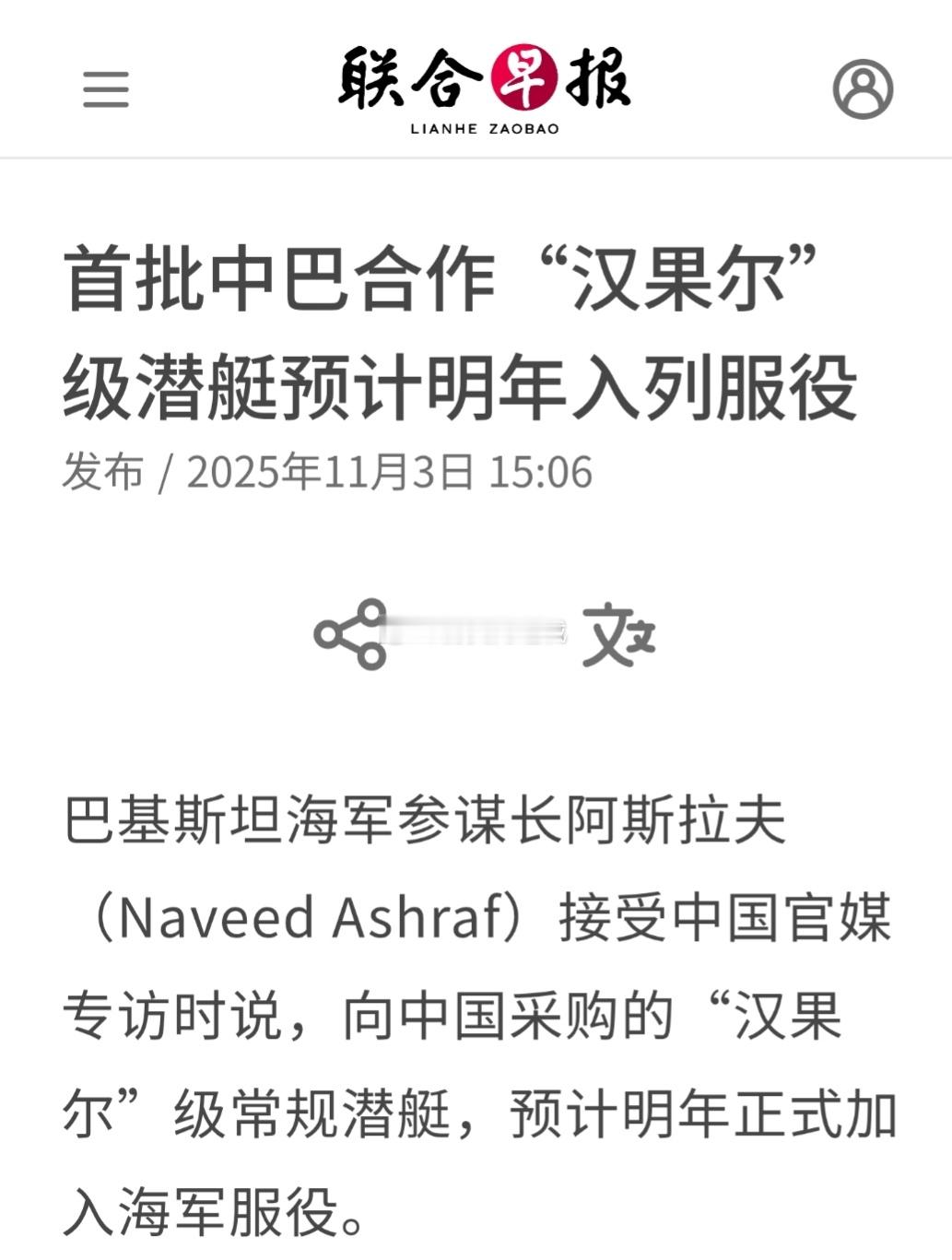 巴基斯坦海军参谋长阿斯拉夫接受专访时说,向中国采购的“汉果尔”级常规潜艇,预计明年正式加入海军服役。阿斯拉夫表示,“汉果尔”潜艇项目进展顺利,今年早些时候,第二艘和第三艘“汉果尔”潜艇在中国成功下水,标志着中巴海军合作取得“重要的里程碑式成果”。