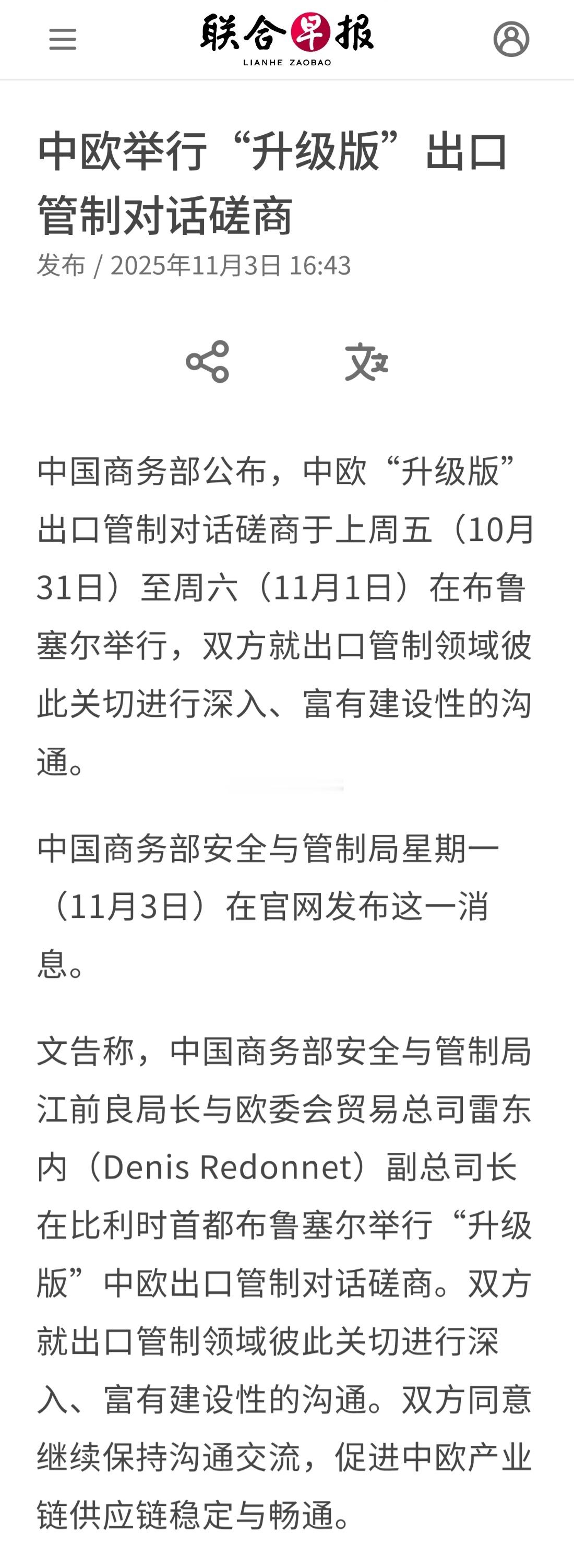 中国商务部公布,中欧“升级版”出口管制对话磋商于上周五(10月31日)至周六(11月1日)在布鲁塞尔举行,双方就出口管制领域彼此关切进行深入、富有建设性的沟通。中国商务部安全与管制局星期一(11月3日)在官网发布这一消息。