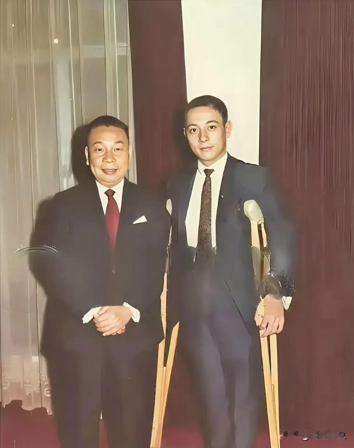 大家仔细瞧,小蒋身旁拄拐的男子并非残疾人,而是他35岁的长子蒋孝文。 当年,老蒋对蒋孝文寄予厚望,盼他能继承大业、传承衣钵。只可惜,他十五六岁便露出公子哥的做派,每日流连夜场,喝酒飙车。他曾枪击蒋介石卫士李之楚,引发广泛热议。此外,他还多次酒后驾车肇事,甚至驾车闯入军事禁区,简直是肆意妄为。 到了三十岁,蒋孝文患上严重的糖尿病,35岁时已需拄双拐行走,连医生都无计可施,私下劝诫小蒋好好管束儿子,不然他随时可能倒下。 1970年,蒋孝文因糖尿病和酗酒突然昏迷,智力受损,生活无法自理,只能终日卧床。这位曾大名鼎鼎的“第三代接班人”,在病床上一躺就是十八年。1989年,他终因咽喉癌在台北荣民总医院病逝,结束了荒唐的一生。