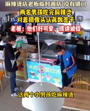孩童的诚信,温暖了兵荒马乱的成年人。新疆巴州街角,一家麻辣烫店老板因着急去医院看母亲,匆匆离店,忘了锁门。两个小学生放学路过,被香气吸引,忍不住探头张望。店里空无一人,只有热气腾腾的锅底和堆成小山的签子。孩子们犹豫片刻,最终决定“自助”一碗麻辣烫。 他们小心翼翼取菜、煮食,吃饱后却犯了难——没人收钱,怎么办? 这时,一个孩子指着角落的监控探头说:“我们对着它数签子,把钱放柜台上!”于是,两人认真地数起签子,一边数,还一边说,“1、2、3、4......"数完,两个小男孩把零钱和签子整整齐齐码在柜台离开。这一幕,被监控完整记录。 店主回来看到后,看到码的整整齐齐的签子和钱,眼眶一热。 本来母亲生病,生意也忙不开,有些焦头烂额,但孩子们的行为,让他心里暖暖的。更暖心的是,他把监控视频发到网上,配文:“他们好可爱,好有诚信!” 网友纷纷点赞:“这碗麻辣烫,吃出了人间温暖!”“孩子们的一举一动,让我相信世界还有纯真。”是啊,在这个快节奏的时代,孩子们的诚信像一束光,照亮了我们的心。原来,信任和善良,从来都不需要刻意培养,它藏在生活的每个小细节里,等着我们去发现,去传递。