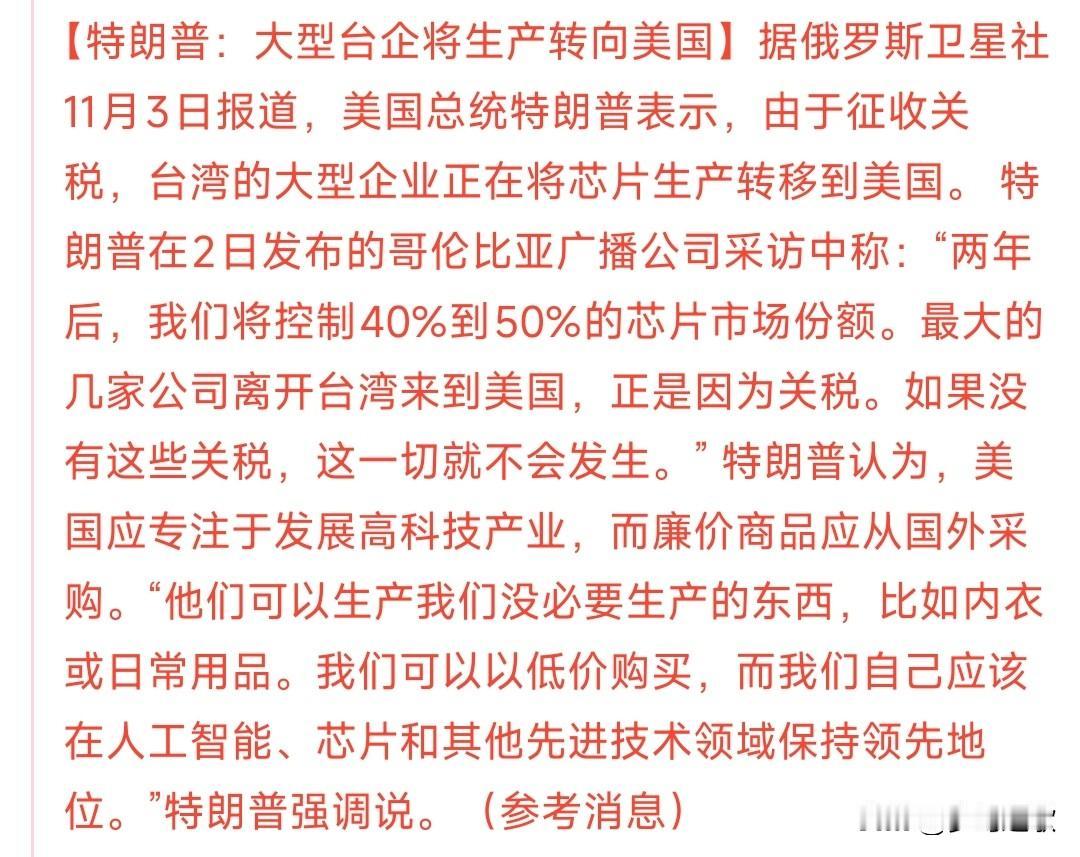 特朗普表示台大型芯片公司将搬去美国,无疑给台独分子一记釜底抽薪 特朗普在参访当中表示:台湾正在把大型生产芯片的公司往美国转移,并表示两年后会控制40%-50%的芯片生产。 不难猜出,如果这是真的,台积电肯定在其中之列,这无疑对于台独分子是一个重大打击,现在台独之所以这么猖狂,就是有足够的资金能够支持他们的活动,如果大型科技公司都去了美国,台独基本上自己就得从内部瓦解。 2025年中国台湾地区的芯片产能占全球的23%,位居全球第一。 台积电一家就贡献了约18个百分点,10纳米以下制程超过69%,7纳米制程占78%,3纳米制程占95%。