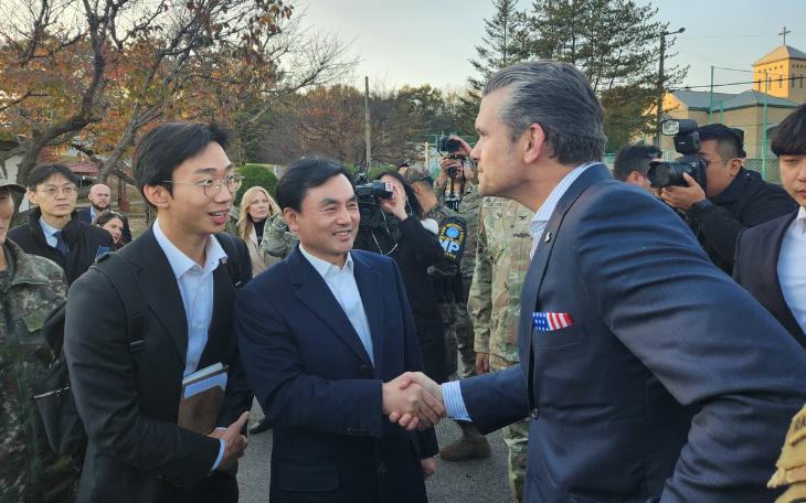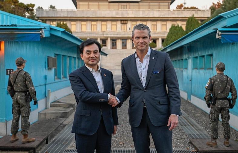 特朗普亚洲之行想做的事,爱将赫格塞斯做到了。 美国战争部长赫格塞斯在对韩国进行正式访问期间,前往戒备森严的非军事区拍照留念。此次访问正值美韩就两国军事同盟未来及驻韩美军在朝鲜半岛角色演变展开关键双边会谈之前。 赫格塞斯乘坐美军直升机抵达非军事区,并在象征意义重大的板门店停战地与韩国国防部长安圭伯举行会晤。 当然,这一留影,更具有象征性和宣言意义,向外界展现了“韩美同盟的力量以及共同防御态势"。