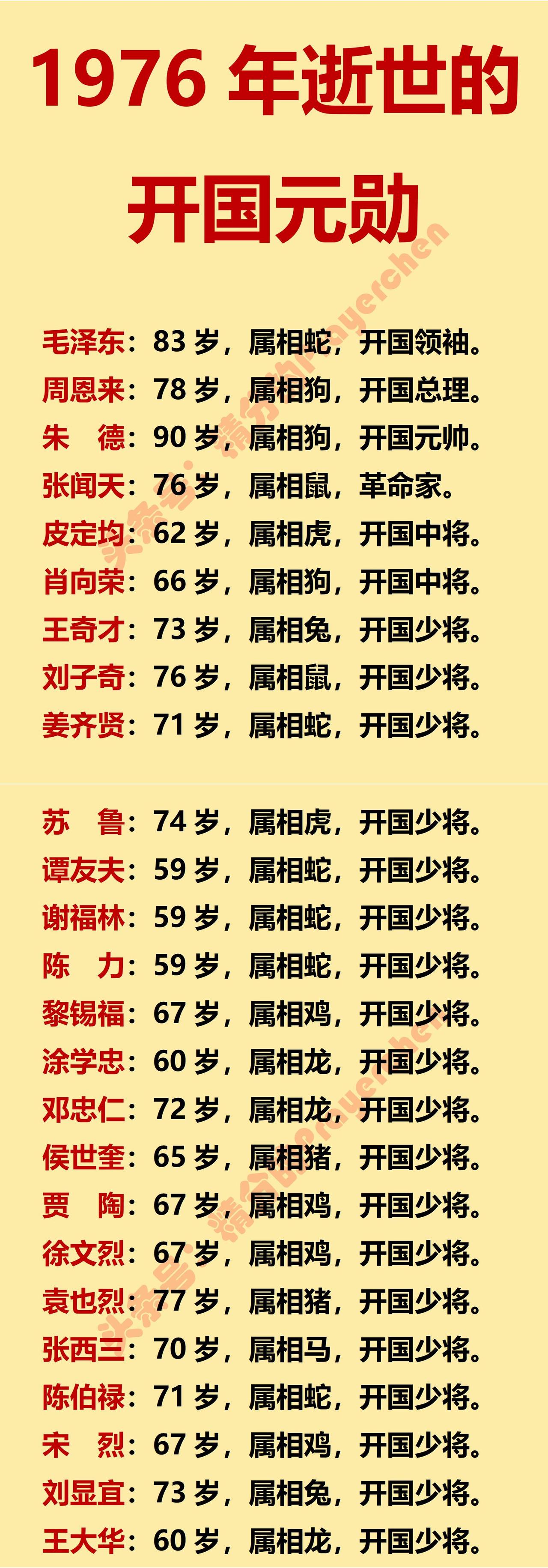 1976年逝世的开国元勋名单。 根据历史资料及统计,这一年是我们新中国成立之后开国元勋逝世人数最多的一年,一共有25位。 这一年,周恩来总理、朱德老总、毛主席相继离世,标志着一个时代的结束。 而皮定均等优秀开国将领的逝世,使军队丧失了一大批经历过长征、抗战和解放战争的实战型指导员。 1976年之后的两年,则一共只有4位开国元勋逝世,其中1977年两位开国少将逝世,1978年罗瑞卿大将和彭绍辉上将逝世。