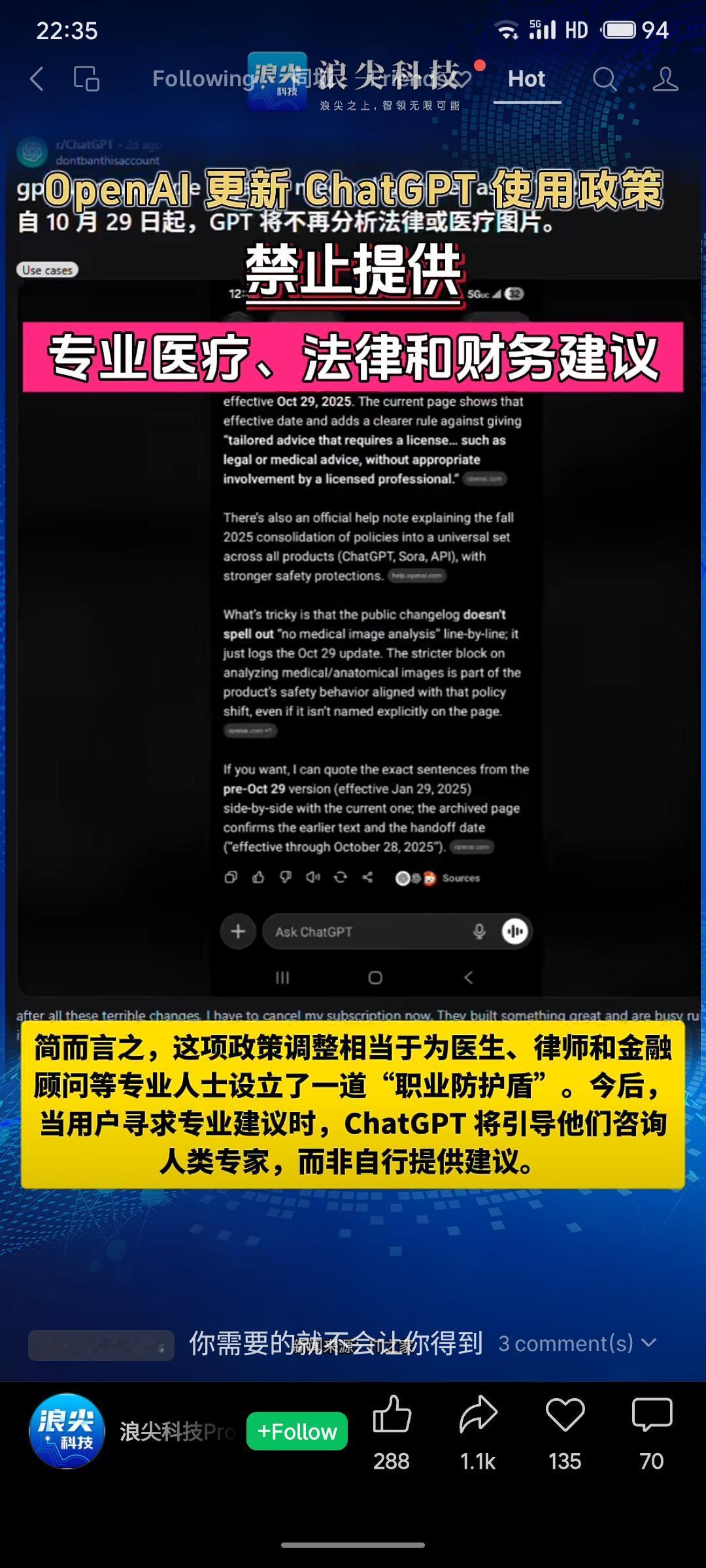 OpenAI于2025年10月29日更新政策,明确禁止ChatGPT提供专业医疗、法律和财务建议,包括解读医学影像等。此举旨在规避AI在高风险领域可能引发的责任问题,符合欧美监管要求,相当于为专业人士建立了一道“职业防护盾”。