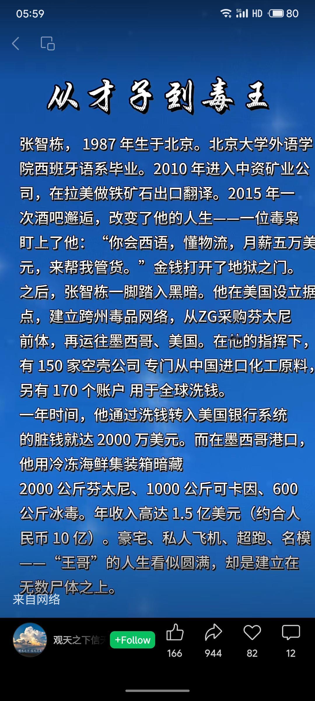 北大才子张智栋利用西语与物流专长,受雇毒枭后建立跨国毒品网络。其通过空壳公司从中国采购芬太尼前体,经墨西哥运往美国,年收入高达10亿元,最终被FBI逮捕。