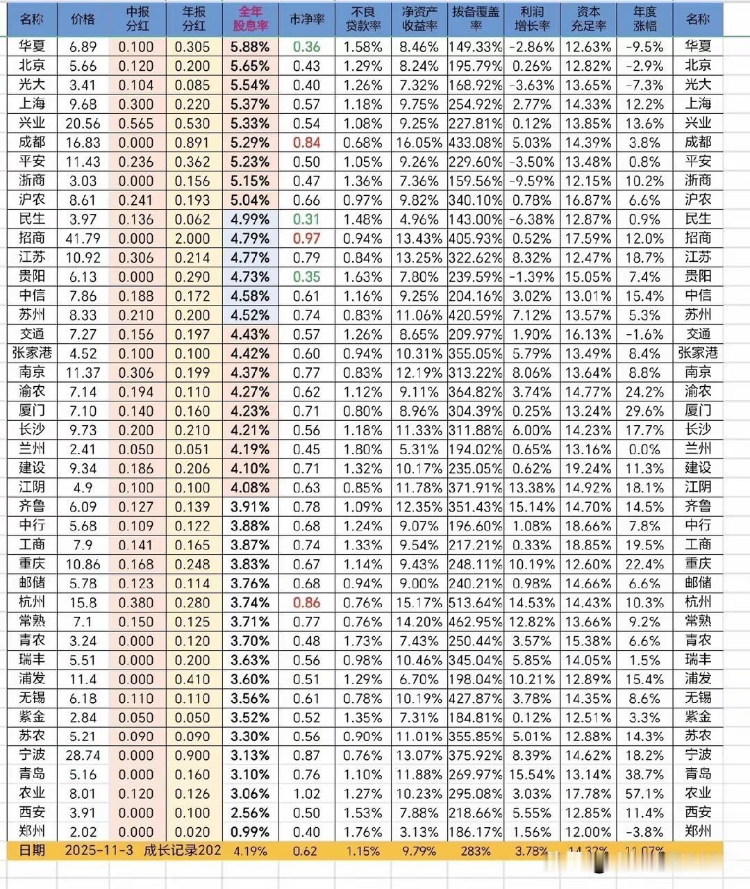截止2025年11月3日收盘,银行板块股息率3.99 %。 超过5%股息率的仍有9家,但是其中4家净利润同比下降,下次分红可能也会下降。 下图最新股息率排名,来自股友“成长纪录2020”,谢谢这位股友,让我节省不少时间。