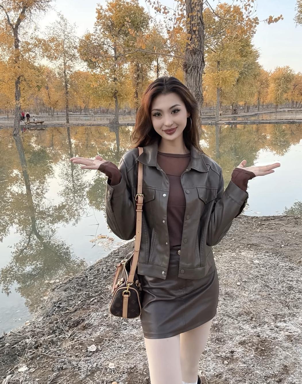 豹纹外套搭配黑色皮裙,尽显都市摩登风!👗👠💄