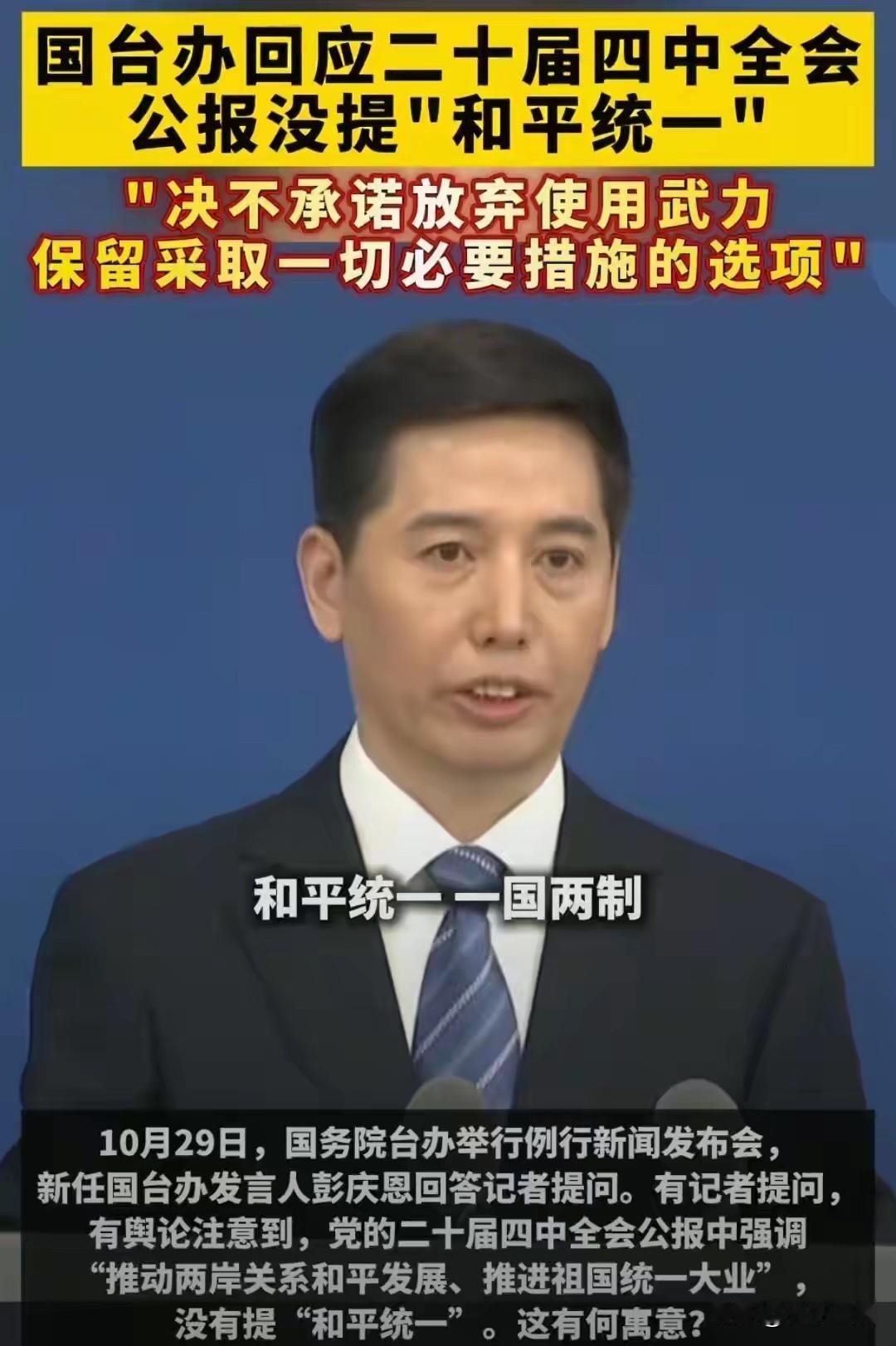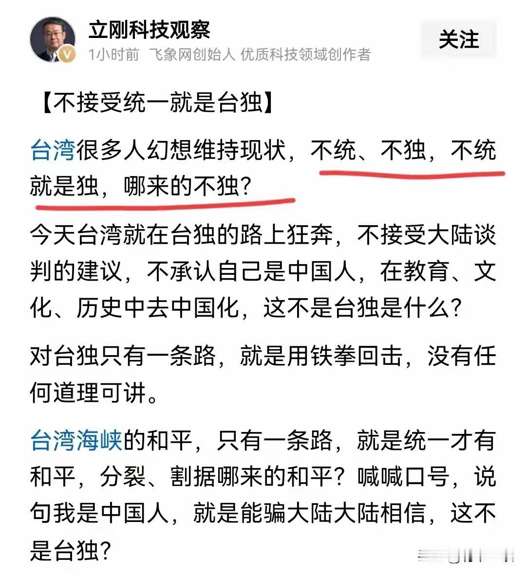 台湾统一正在加速! “和平统一”已被删除!项立刚:不统就是独! 统一进程按下快进键,这3个信号藏不住了! 所有人都在紧盯二十届四中全会公报的一个细节:涉台表述里,“和平统一”四个字消失了,取而代之的是“推进祖国统一大业”的坚定表态! 项立刚一句话点透本质:“不统就是独!” 这绝非简单的文字调整,而是大陆对台立场的重大转向——从“被动等待”到“主动推进”,从“预留余地”到“划定红线”,台湾统一的倒计时,已经正式启动! 一、文字之变,是对“台独”的终极警告 别再误以为“删词”是放弃和平,恰恰是和平的空间被“台独”势力逼到了墙角。 “和平统一”的表述可以删,但维护领土完整的决心,永远刻在民族的骨血里! 二、主动出击,统一大业再也“拖不起” 为什么现在必须加速?因为时间站在我们这边,但分裂势力的挑衅再也等不得。 更关键的是,民族复兴的脚步不会停,台湾问题不能成为拖累复兴的“绊脚石”。过去我们“以时间换空间”,是为了积蓄力量;如今力量足够,自然要主动推进,让统一大业跟上民族复兴的节奏。 三、“不统就是独”:打破模糊,划定终极底线 项立刚的“不统就是独”,戳破了多年来的模糊地带。维持现状就是台独。 过去有些声音试图用“维持现状”拖延时间,本质上就是给“台独”分裂留空间。这次公报的调整,就是明确告诉所有人:世界上只有一个中国,台湾要么回归祖国,要么走向“台独”死路,没有中间道路可走。
