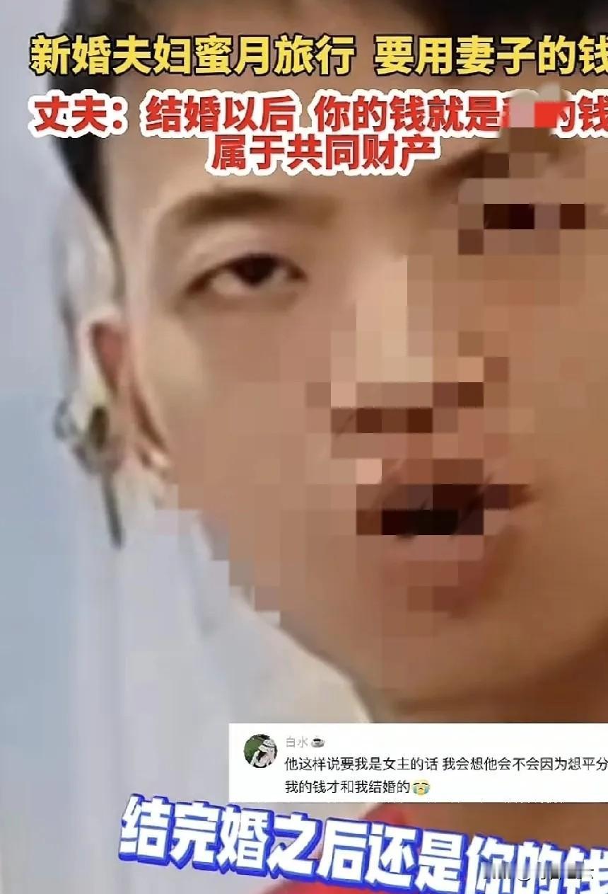 女子婚后第一天晚上问丈夫:“去旅游吗?”丈夫回应:“去呀!”女子又问:“用谁的钱?”丈夫答:“用我的钱。”女子质疑:“你那里还有钱?”丈夫的回答让女子颇为惊讶,他说:“你的钱不就是我的钱吗?”女子强调:“那是我婚前财产。”丈夫赶忙反问:“你懂什么是婚姻法吗?没结婚前那是你的,结了婚还是你一个人的钱,那还叫什么婚姻法?婚姻法规定,结完婚之后就是共同财产。”女子不满道:“我婚前辛辛苦苦攒的钱,就这么莫名其妙、还合理合法地被你划走一半? 这事儿里妻子的委屈,根本不是纠结旅游花几百块。是她攒了好几年的血汗钱,明明是婚前自己熬出来的。 丈夫一句话就给“归了俩人”——那种“我的东西怎么突然不属于我了”的不安,比直接让她掏钱包还扎心。 丈夫错把“夫妻该不分你我”当成了“可以随便动对方婚前财产”,法律上的共同财产是婚后赚的部分,婚前那笔可不算。 他以为是表忠心,反而让妻子觉得,连自己的劳动成果都没被尊重。婚姻里的“我们”得先站在“我”的基础上啊,连彼此的财产边界都不认可,以后日子咋能不拧巴? 各位读者你们怎么看?欢迎在评论区讨论。