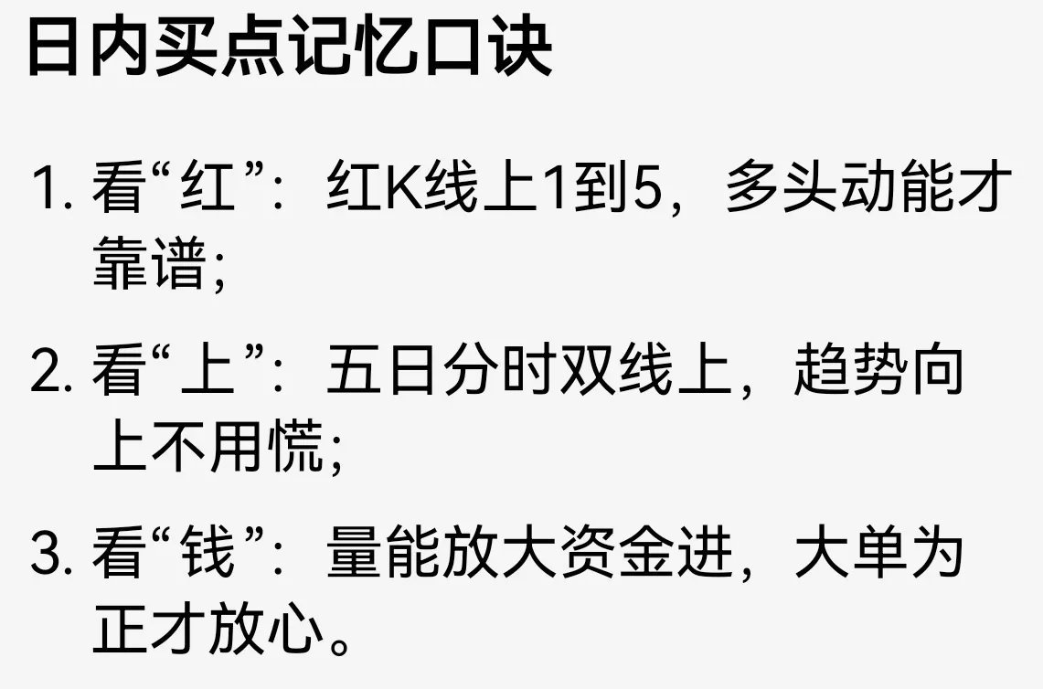日内盘中买点三条件,拒绝盲目入场。1. 不“红”不买:当日需为红K线,且涨幅控