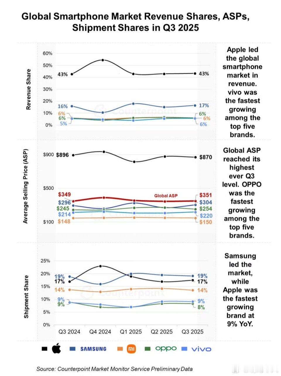 Counterpoint统计的2025第三季度销量全球前五的品牌的手机的份额和均价ASP: