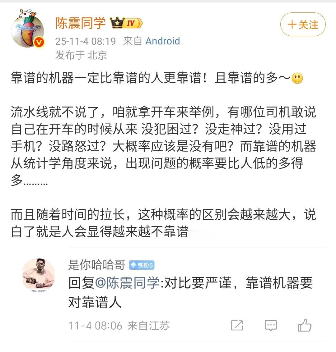陈震:靠谱的机器一定比靠谱的人更靠谱!且靠谱的多~[微笑] 流水线就不说了,咱就拿开车来举例,有哪位司机敢说自己在开车的时候从来 没犯困过?没走神过?没用过手机?没路怒过?大概率应该是没有吧?而靠谱的机器从统计学角度来说,出现问题的概率要比人低的多得多。 各位是怎么看的?欢迎评论区留言。