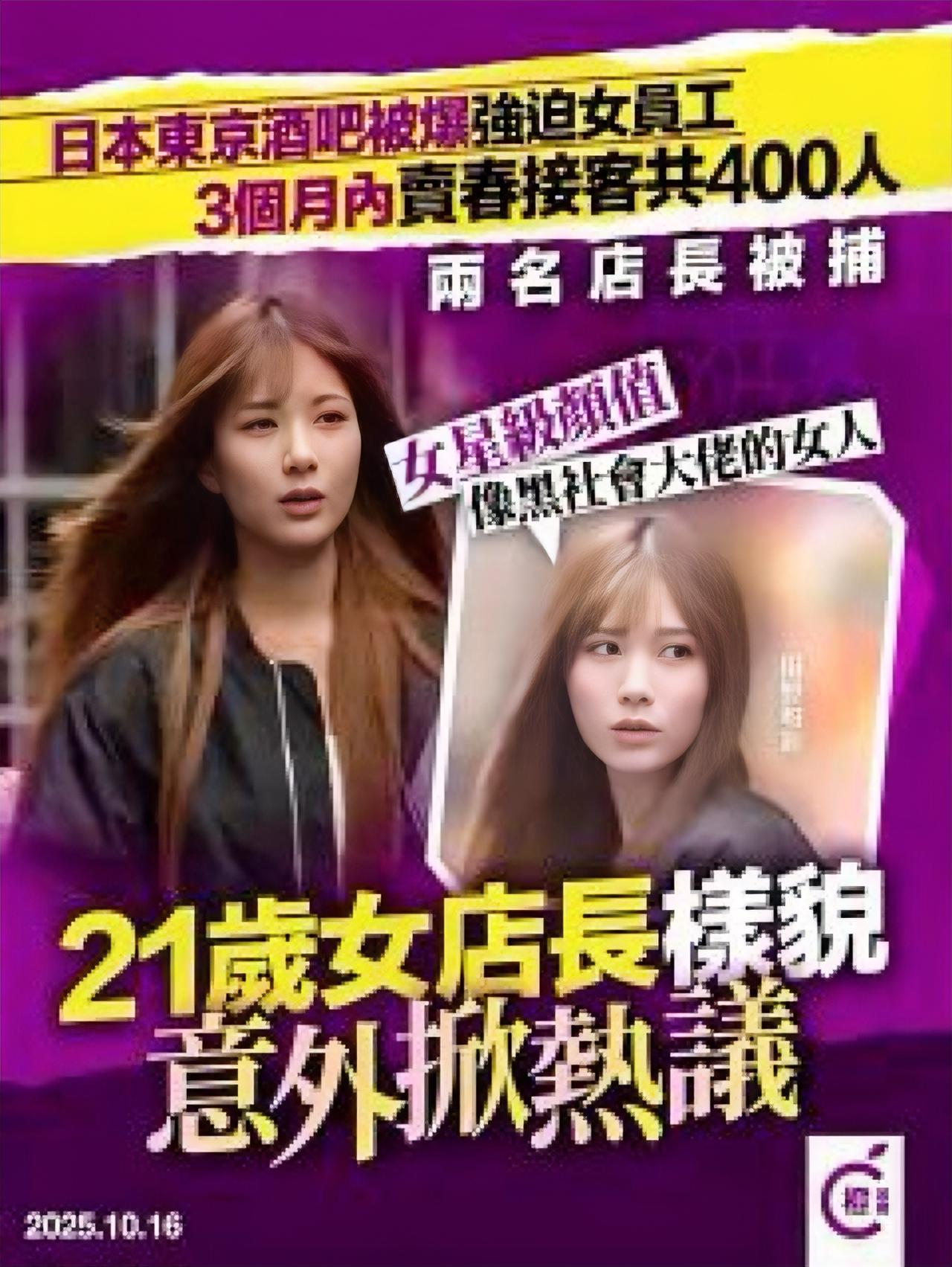 21岁女店长逼员工卖淫接客400人,颜值意外成焦点 日本东京池袋一家“女孩酒吧”近日被曝出黑幕重重——21岁女店长田野和彩与39岁男店长铃木麻央涉嫌强迫员工卖淫,短短三个月内竟让一名20多岁女店员“接客”高达400人! 警方调查发现,这名受害女子自2024年9月入职后,就被迫在店内留宿,常遭辱骂、殴打、监控行踪甚至被威胁,整个人几乎被“软禁”在店里。她身上多达20多处瘀伤,令人发指。 事件曝光后,女店长田野和彩被捕并认罪。然而让人意外的是,她的高颜值反倒在网络上掀起热议,不少网友留言:“长得像女星”、“气质冷艳,像黑帮大佬的女人”,甚至有人感叹“狠人长得都这么漂亮?” 这起事件不仅揭开了夜店产业的黑暗角落,也引发社会对年轻女性陷入性剥削陷阱的反思。