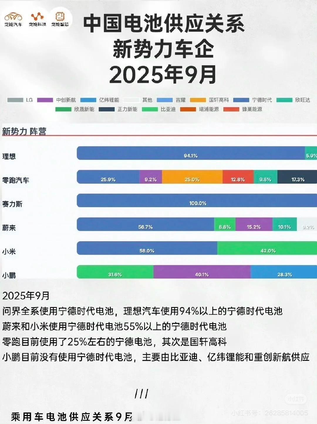 主流新势力车企动力电池品牌比例一览表[doge]。理想即使94%用的都是宁德,但也只占宁德总出货量的5%,可见宁德一家独大的厉害[good]。还是希望物美价廉的理想牌电池早日量产,期待我的i9能用上[哇]