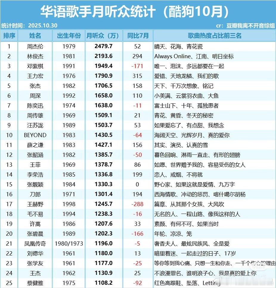 酷狗音乐10月份华语歌手听众统计,陈楚生的《庙堂之外》都能排进他的歌曲热度前三了,居然还超过了他的大爆曲《有没有人告诉你》,湾区升明月晚会演唱《庙堂之外》出圈效果显著。[彩虹屁][彩虹屁][彩虹屁]