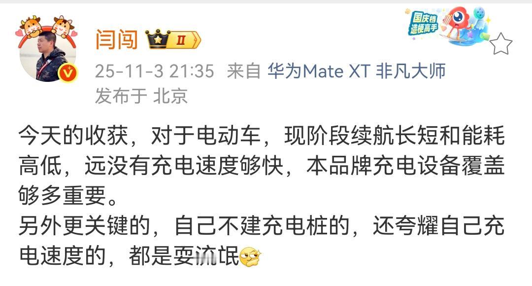 闫闯:自己不建充电桩的,还夸耀自己充电速度的,都是耍流氓! 这样算起来有好多品牌都没有自建充电桩,不过有的品牌是投资了其他充电桩企业。 其实现在而言,所有的充电桩都要支持其他品牌的充电,只是充电桩的适配程度不一样,有的车型不太适配其他的品牌充电桩,所以充电就很慢。 最重要的还是普及充电桩的覆盖范围,在一些偏远地区也要覆盖充电桩。同时高速公路的充电桩越多越好,甚至每个停车位都有充电桩最好,这样在节假日高峰期的时候,充电难的问题就能大的幅度减缓。 各位是怎么看的?欢迎评论区留言。
