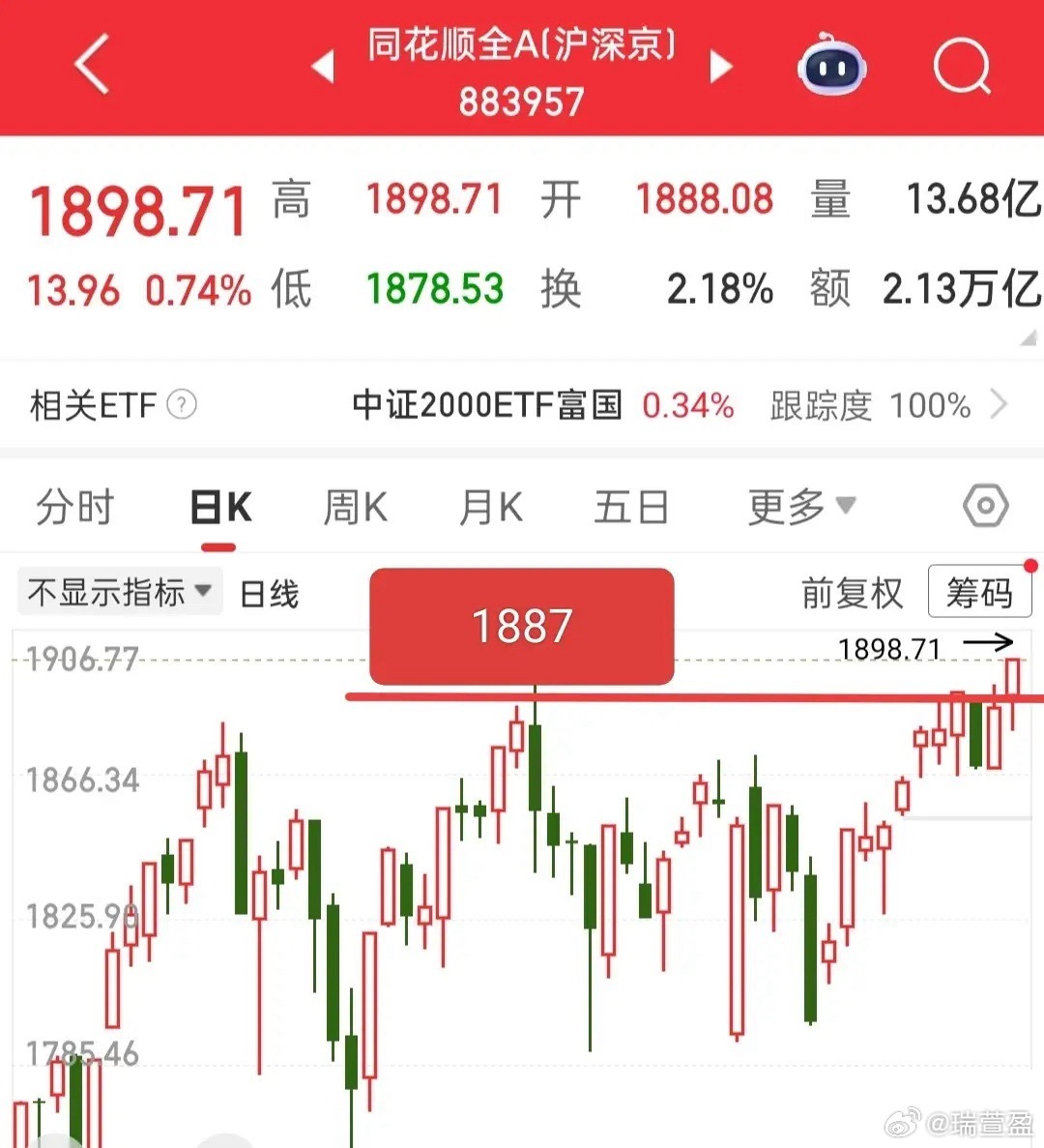 今日依旧聚焦全A走势,昨天题材股集体拉升后,今天大概率会迎来分化。核心关注全A的做多支撑位1887点,“鹅头”形态通常只会盘整1-2天,之后便会向新高发起冲击,对应的核心参考就是中证2000,要是没有全A数据,紧盯中证2000的3113点支撑就行!