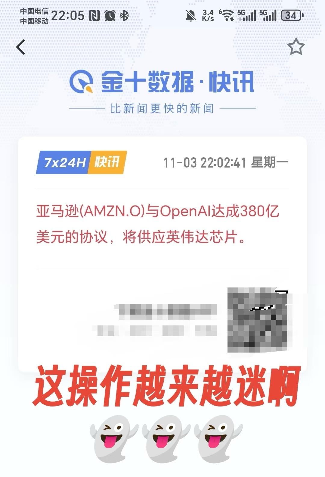 亚马逊与OpenAI达成380亿美元的协议? 现在越来越看不懂老美Ai圈了,这操作越来越迷了。 刚看到这个快讯,亚马逊和Open AI达成380亿美金的协议,供应英伟达芯片..... 是不是说,亚马逊买英伟达的芯片给OpenAI,然后Open AI给亚马逊干活? 还是什么呢? 现在整个华尔街都和Open AI绑上了千丝万缕的关系,想逃也逃不掉了。