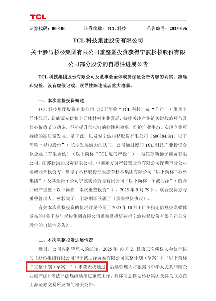 11月3日晚间,TCL科技集团股份有限公司公告参与杉杉集团有限公司(600884.SH)重整暨投资获得宁波杉杉股份有限公司部分股份的自愿性进展情况。