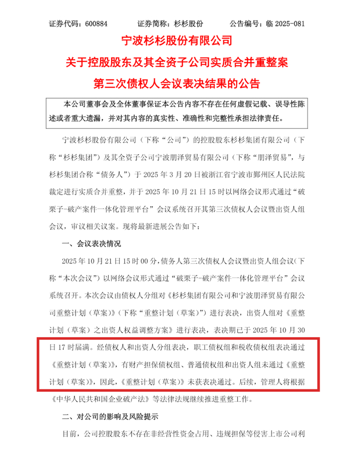 然而,根据杉杉股份公告,最终职工债权组和税收债权组表决通过,但有财产担保债权组、普通债权组和出资人组未通过该草案。