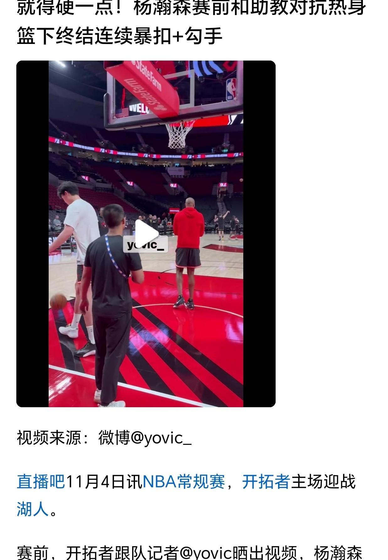 暴扣!看来开拓者队把杨瀚森下放到发展联盟训练还是起到效果了,在对阵湖人的比赛之前,杨瀚森在助教的帮助下进行热身,不仅敢于对抗,而且还有各种暴扣,单手和双手都有。可以这么说,如果在正式比赛中杨瀚森可以打得这么强硬,即使没有得分,教练也会把他留在场上更久,现在要的就是小杨的态度,拿分只是水到渠成的事而已!