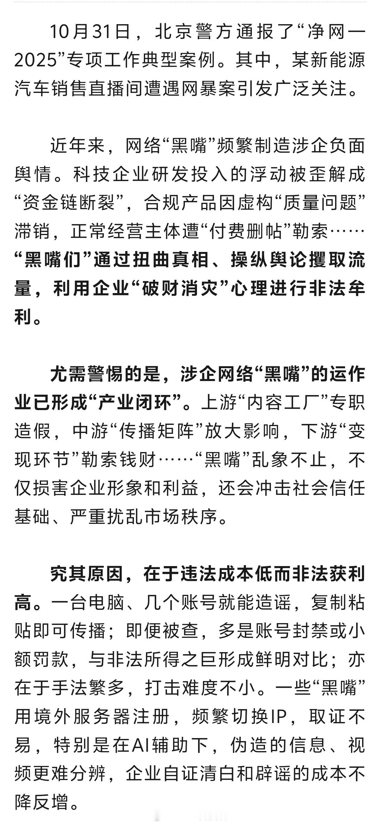 黑嘴通过扭曲真相,操纵舆论攥取流量,利用企业“破财消灾”心理获利。成本低、获利高。