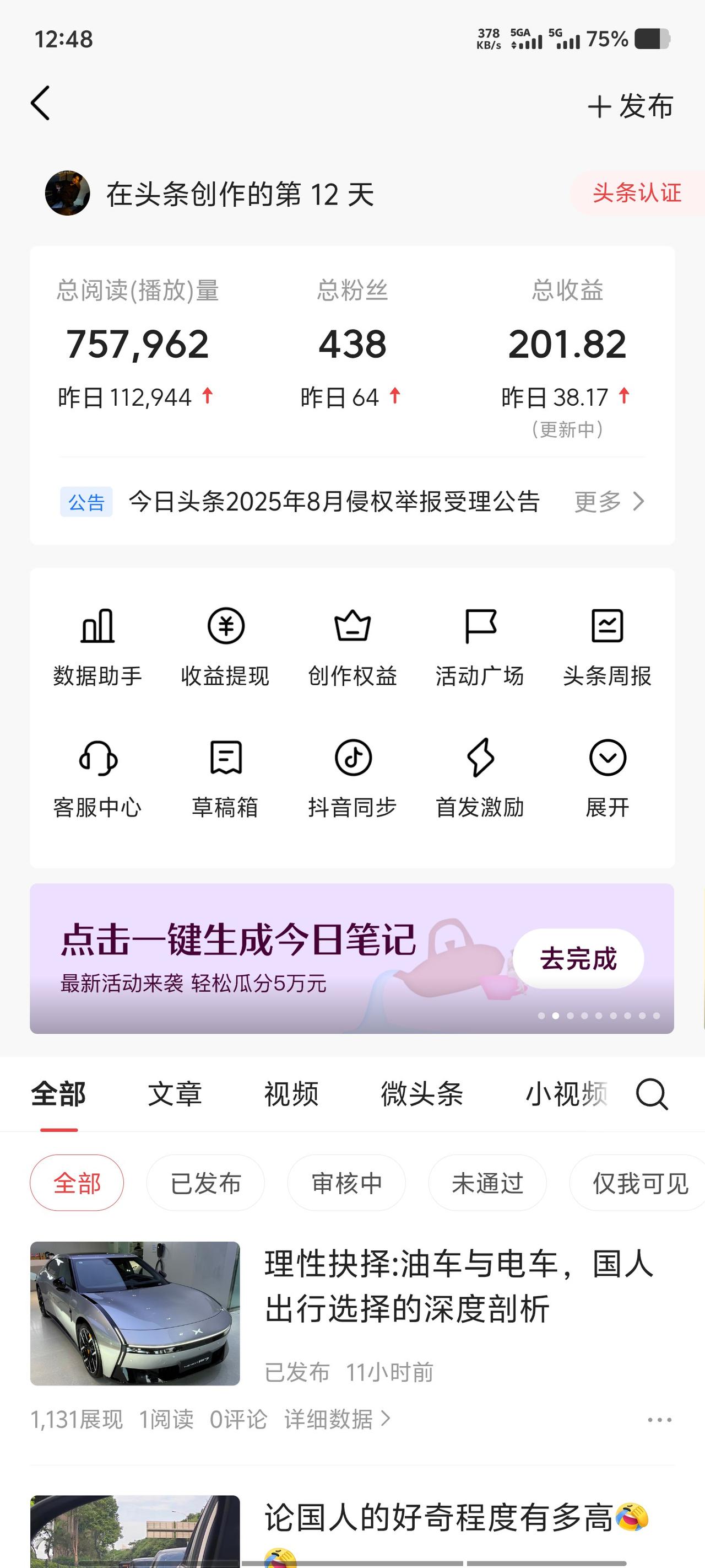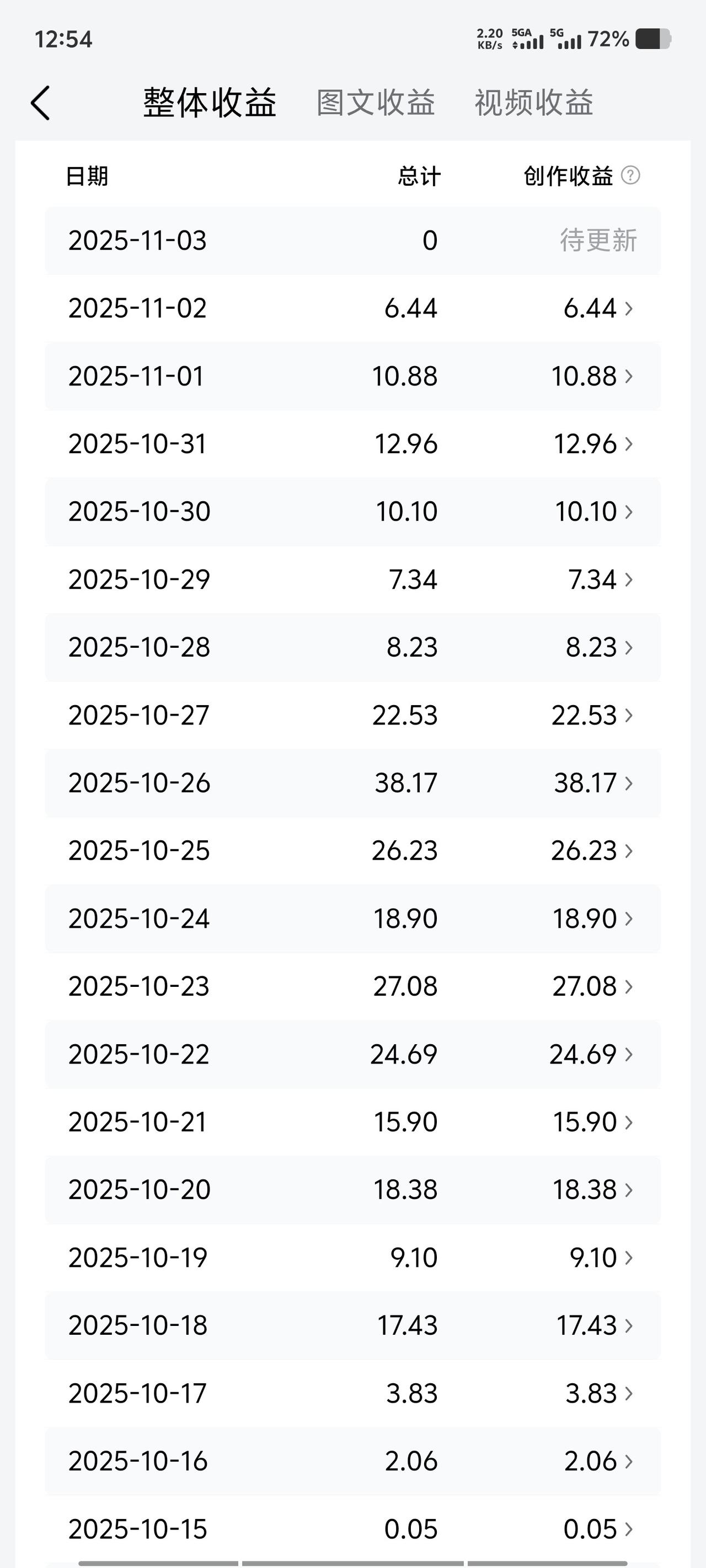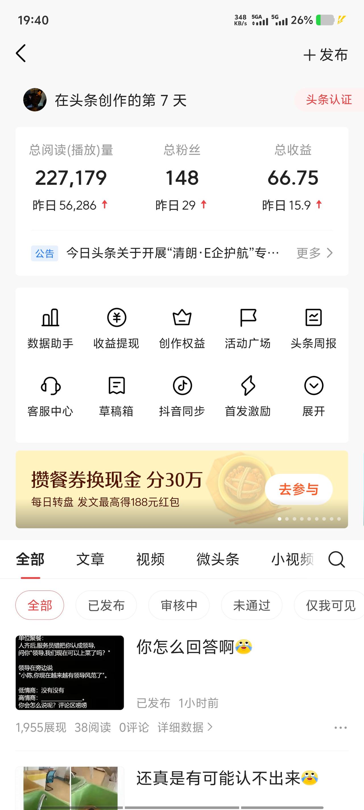 今日头条创作的20天,总共给了200多块钱,忽高忽低,单价每天都不一样,文章部分压根没有任何流量可言,写了有20多条文章给了不到10块钱,视频发了10多个也没几块钱,主要的收入来源是微头条,流量巨大,容易出爆款,但是单价太低,有一篇10万➕的才给了不到30块钱,真是笑死
