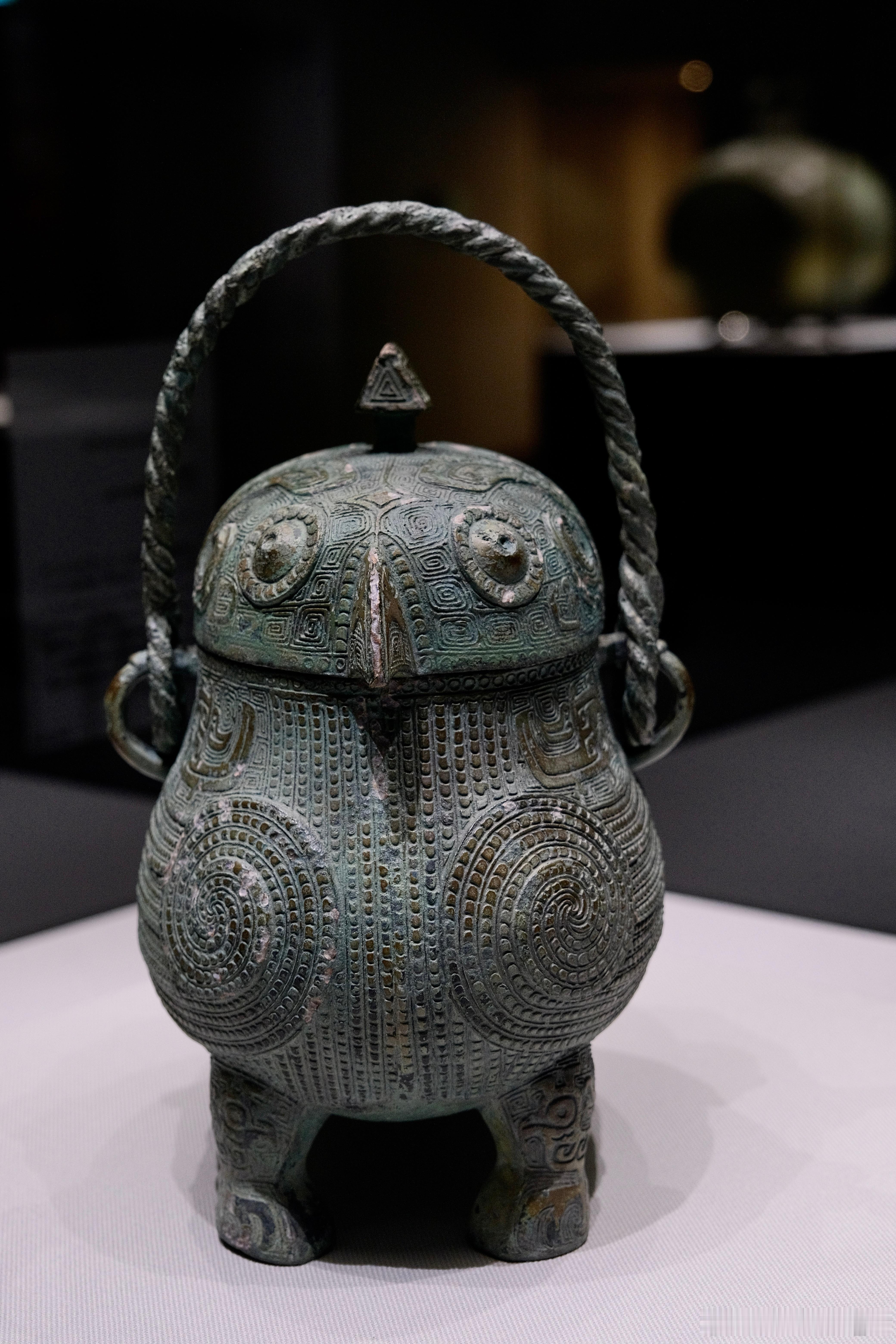 整体为椭圆形,大腹有四足,带盖,盖上有钮,盖、体子母扣接。其造型为两只鸱鸮相背而立,后部相连,挺胸而立,神态自然,栩栩如生。