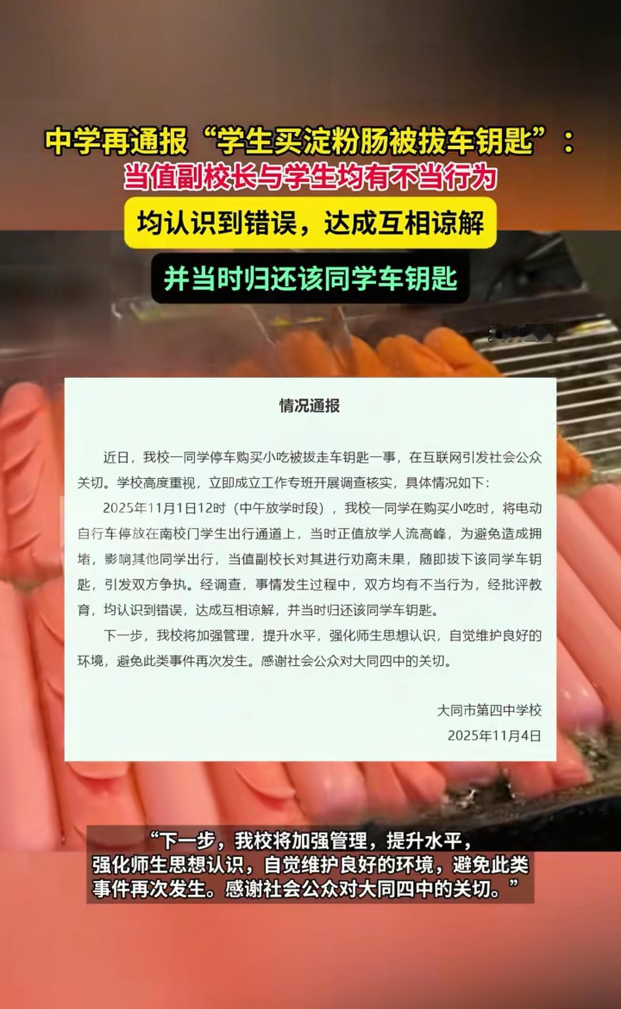 学生校门口买淀粉肠,被副校长拔掉车钥匙后续来了,学校各打五十大板,认为双方都有错,这下副校长可以把心放肚子里了! 学校给出的理由还是很清楚的,按他们的说法,当时属于学校放学的高峰期,车多人多。学生为了卖烤肠把车停在那里,就把路堵住了。 所以副校长是在劝离未果之后,才迫不得已拔掉了车钥匙。所以副校长顶多是方式有点问题,在经过批评教育之后呢,已经和学生互相道歉,并且取得了谅解。 只是我有一点不是很明白啊,从视频来看,当时校门前几乎可以说是空荡荡的,哪里来的造成交通拥堵呢? 而且他把钥匙拔了,车子开不走,不还是得停在大马路上吗,如果真的堵车,那这样做又有什么意义呢? 再说了,11月1日可是周六啊,周六还要上课,这本身就很匪夷所思了。