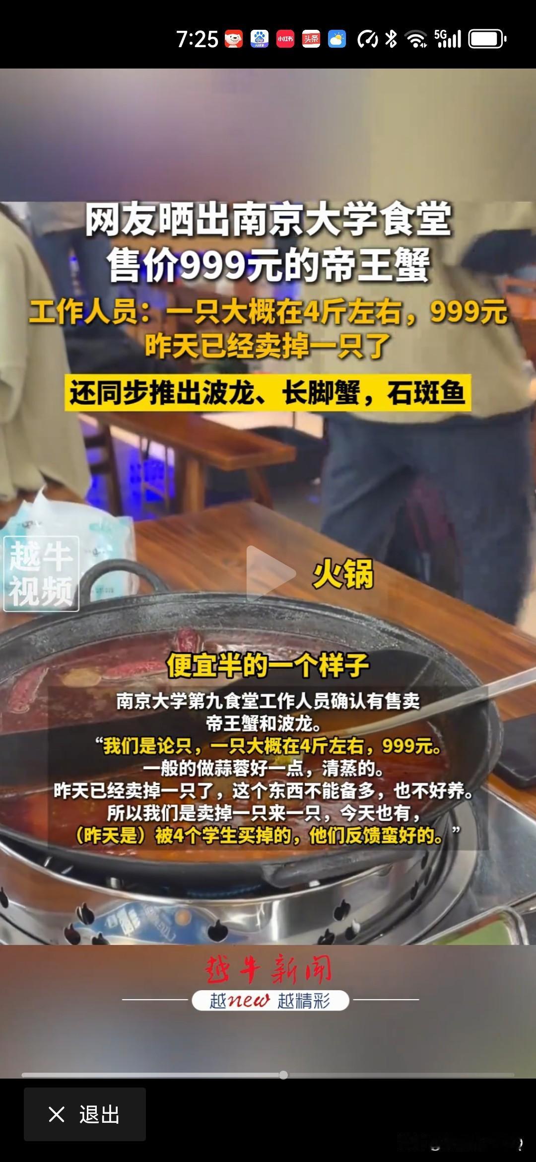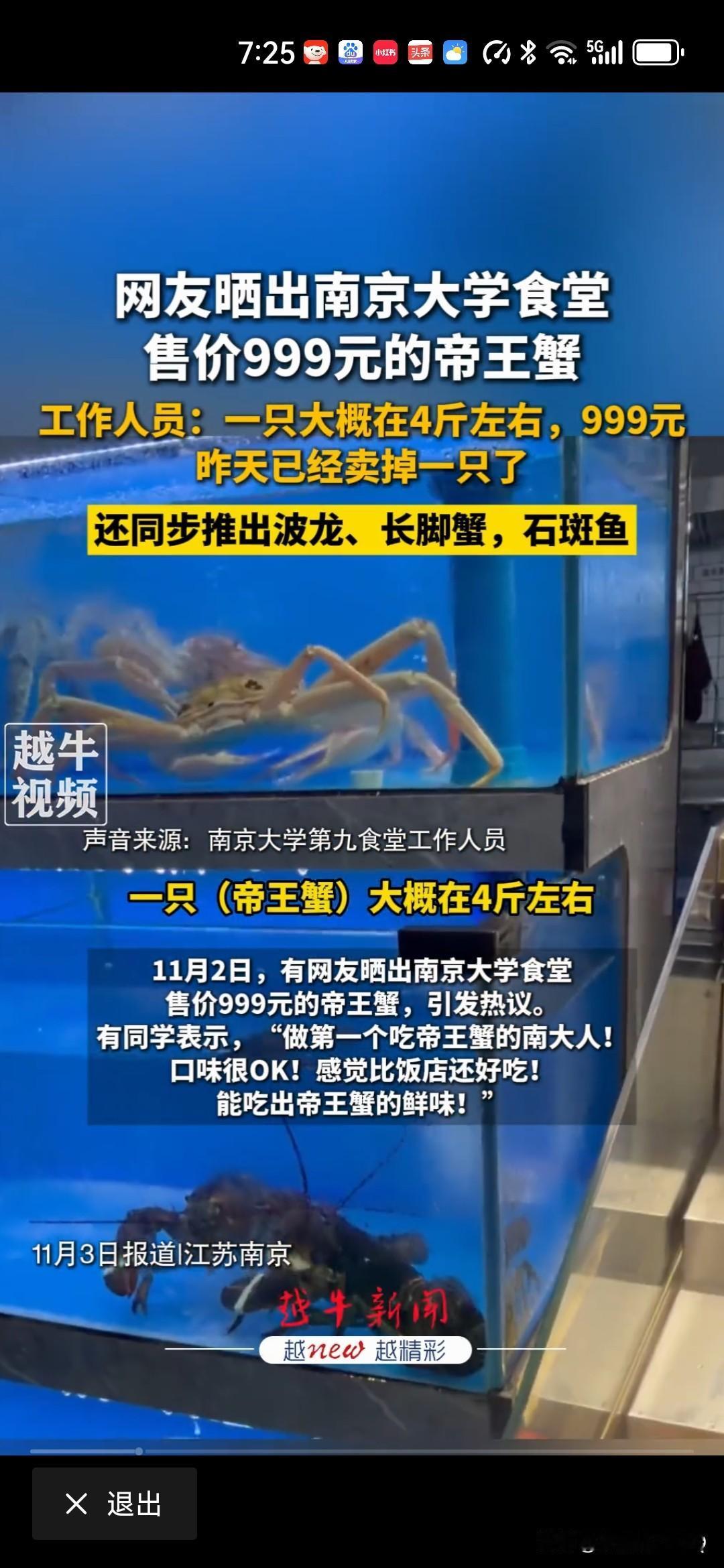 #南京大学食堂推出999元帝王蟹#!大学饭堂也要商业氛围才能生存吗?虽然统一了校服,但消费有高有低,大学生也要社交,所以一款豪华餐厅出品比世面餐厅还便宜,而邀请一些对自己有帮助的人也无话可说,听说一个富有家庭儿子上大学,爸爸叫儿子与导师交往,结果把导师学术研发成果交给父亲做,这样他们家反而成了亿万富翁,存在就是合理!