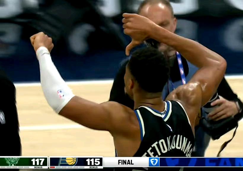 字母哥也会翻身后仰中投,这个世界还是太癫了!绝杀之后字母哥比出手势,来回应步行者的球迷。 字母哥用一记翻身后仰跳投完成压哨绝杀。这是他时隔8年再献压哨绝杀,还创下赛季六场累计200分75篮板35助攻的历史最快纪录。 字母哥在绝杀对手后,用罚单级别的倒拇指和反嘘回应步行者球迷。 这个时候,字母哥的哥哥萨纳西斯跑来抱住字母哥并劝他冷静——看来这就是雄鹿决定签约三兄弟的意义吧,如果萨纳西斯年纪大了,将来担任这一职责的应该就是弟弟亚历克斯了。