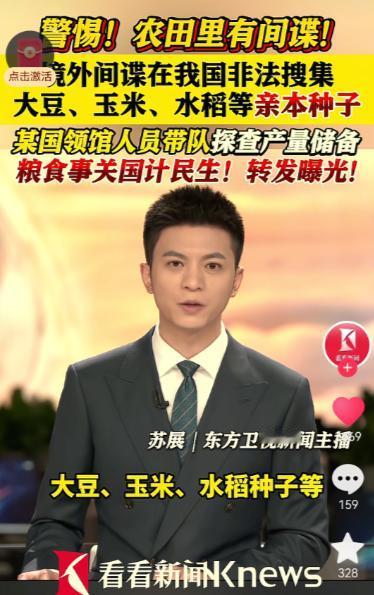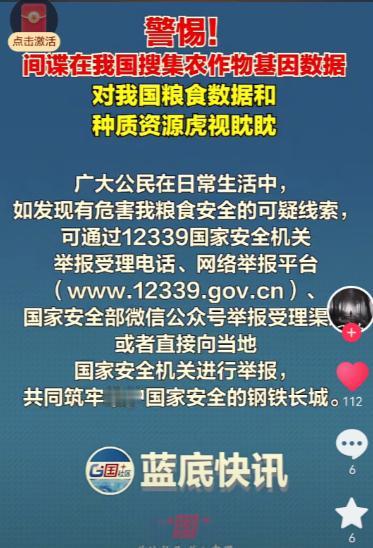 千防万防,家贼难防。事关中国人的万年长久大计粮食问题,被间谍算计上了。近年来违法获取我国大豆,玉米,水稻种子等农作物基因数据,居心叵测,给我国粮食安全带来严重危害。 现在把我们国家所有粮食申请专利,以后全世界种粮都必须给中国专利费,袁老就是没有申请专利,让世界上太多的人吃饱了,反而引来强盗! 国家强大了,要防各种背后黑手,囯安局任务重大,也要宣传别不说,让老百姓都警醒着,让人民保卫国家! 当今世界真的很复杂!防人之心时刻不要大意不能松懈!完善强化我们的社会,还真的要人人团结,共谱美好大中国!