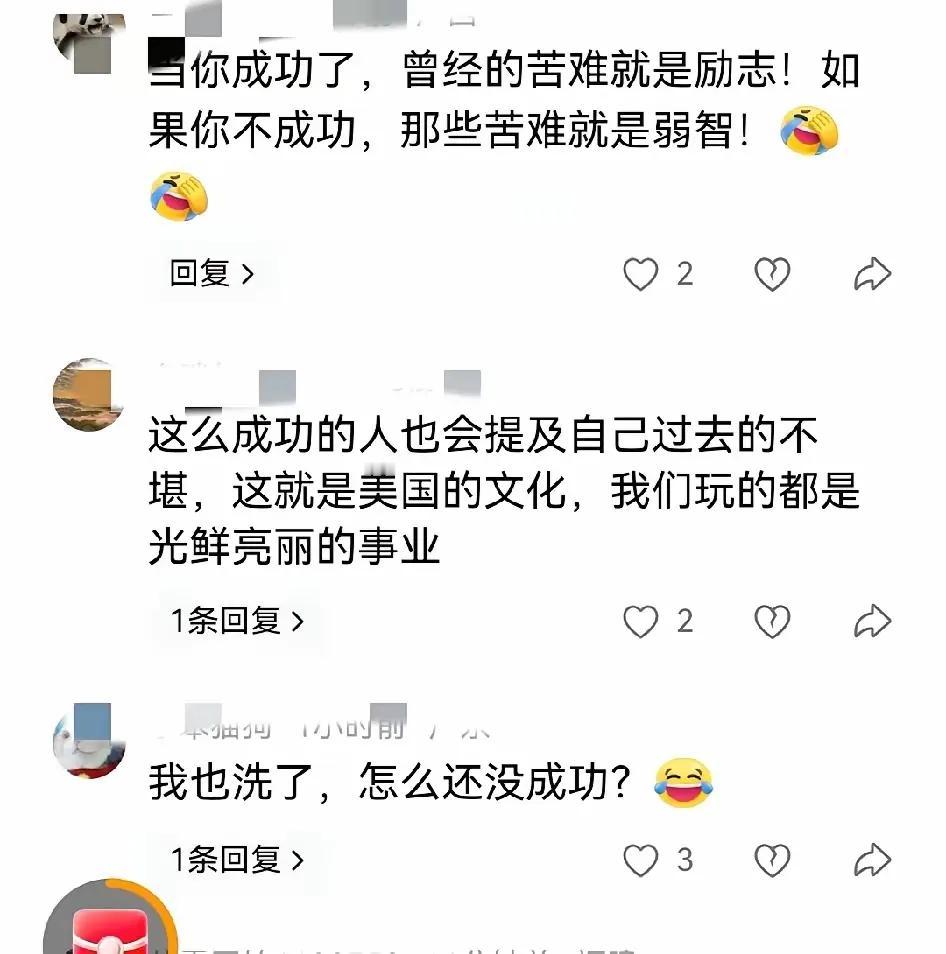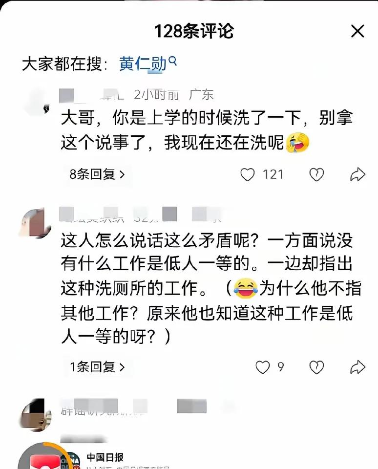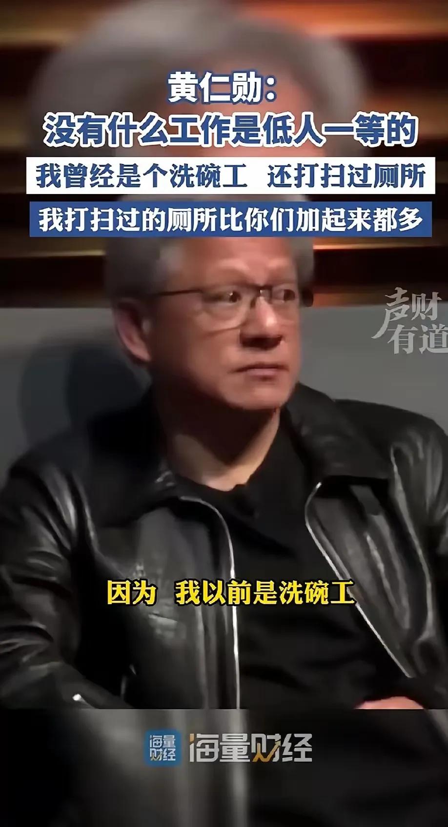 黄仁勋用他曾经当洗碗工,洗厕所的苦难故事,试图教育群众。号称工作没有贵贱。 拜托,什么年代了?还打算用苦难叙事扯淡吗?网友都不是傻子,人家回复的很清楚:当你成功了,你的苦难才是励志故事。如果没成功,那就是一坨SHI! 年轻人只是穷,又不是蠢!