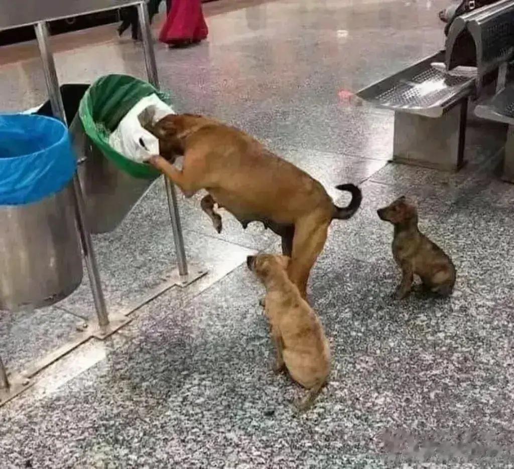 两只小狗崽眼巴巴蹲在旁边,等着狗妈妈能够找到一点点食物。